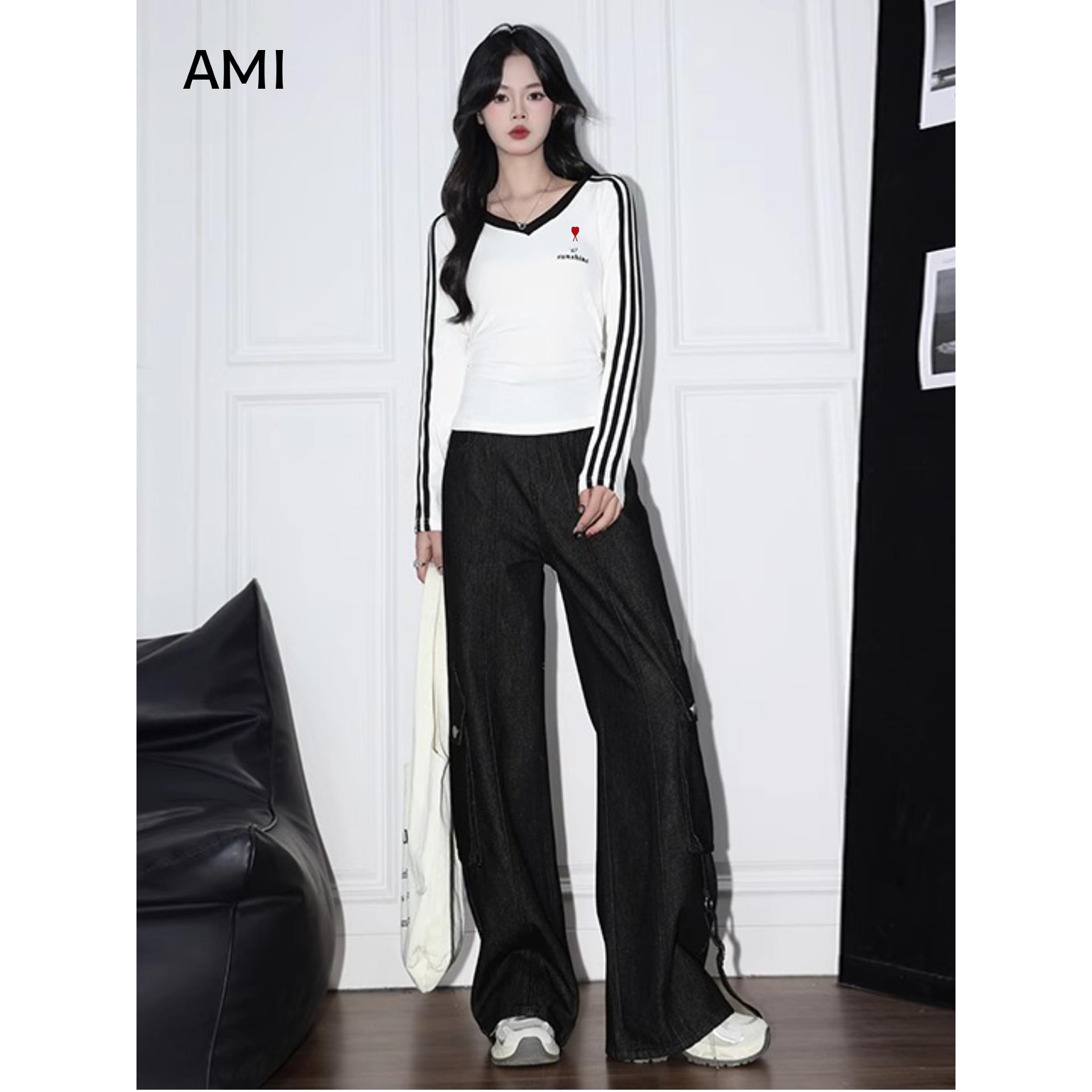 修身 T恤女春秋潮牌正品 V领打底上衣 白色三条杠长袖 AMI2025美式