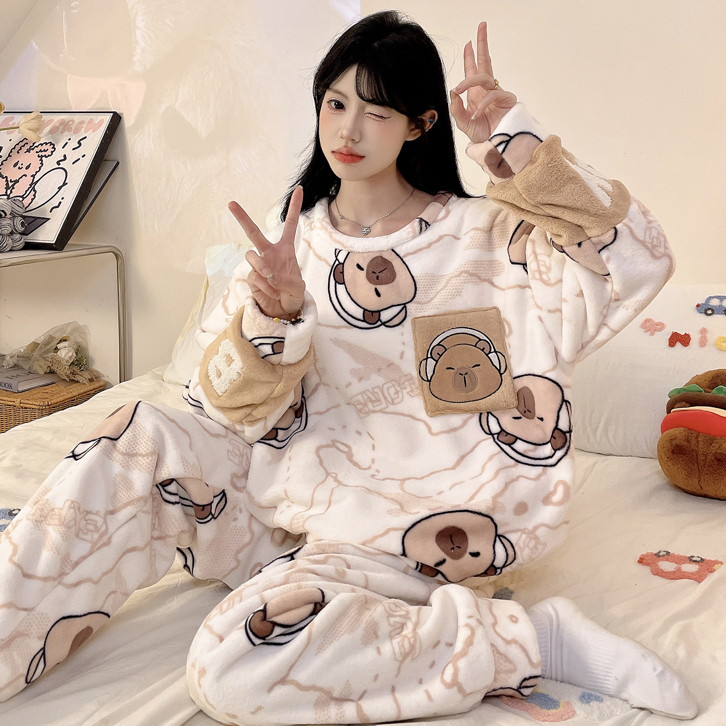 套装 女加厚保暖秋冬法兰绒家居服加肥加大码 珊瑚绒睡衣妈妈款 冬季