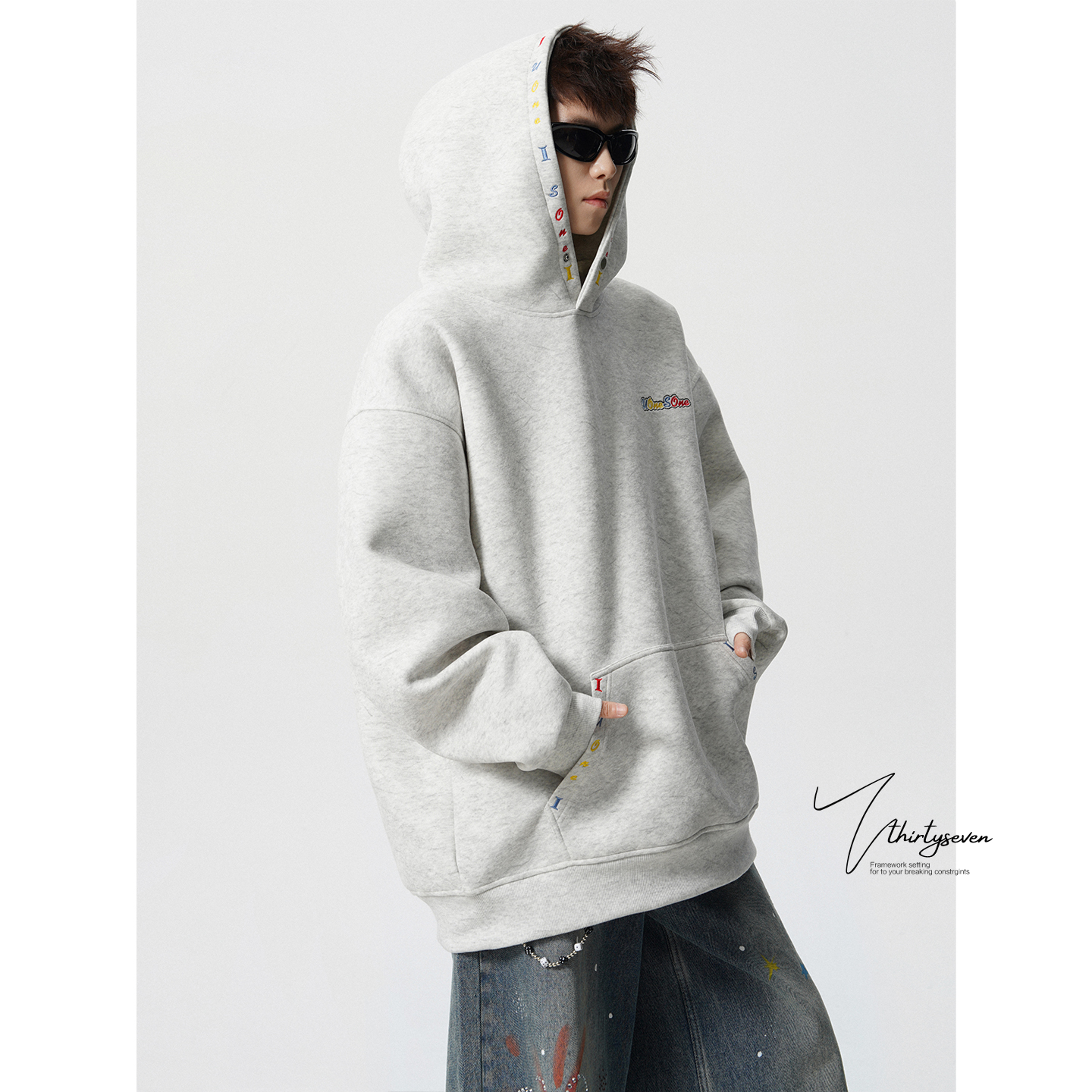重磅砂洗做旧加绒外套 美式 V37潮牌字母刺绣情侣连帽卫衣男款 秋季