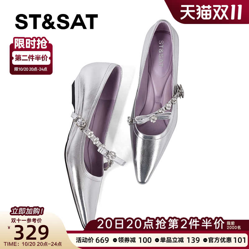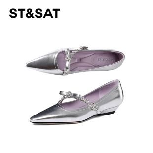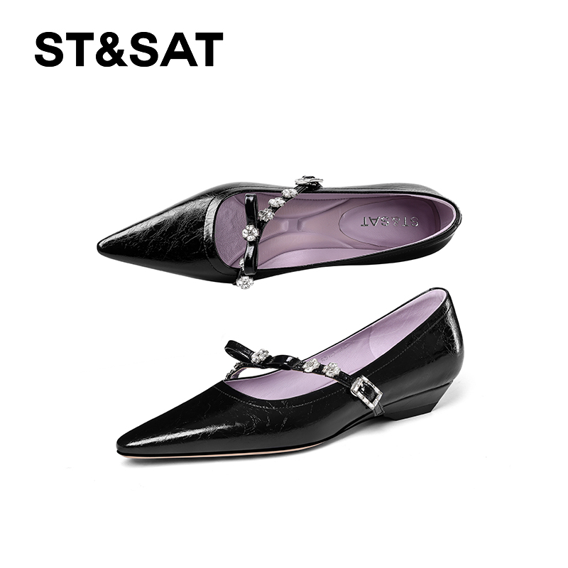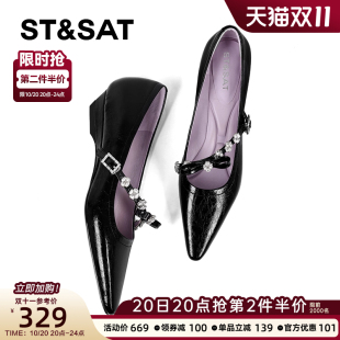 气质显高显瘦女鞋 星期六水钻玛丽珍鞋 女2025春秋尖头浅口坡跟单鞋