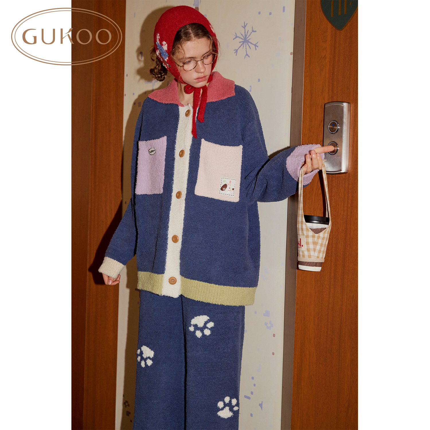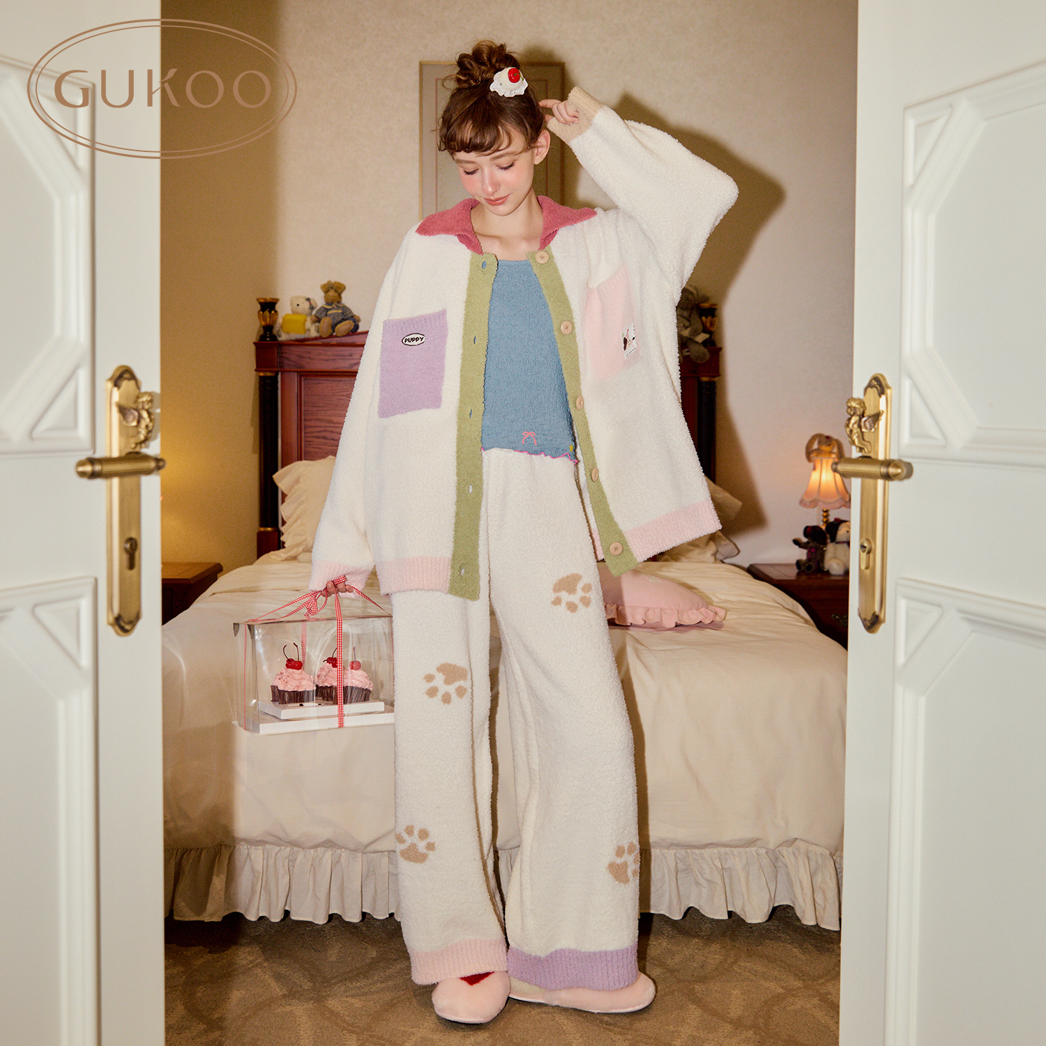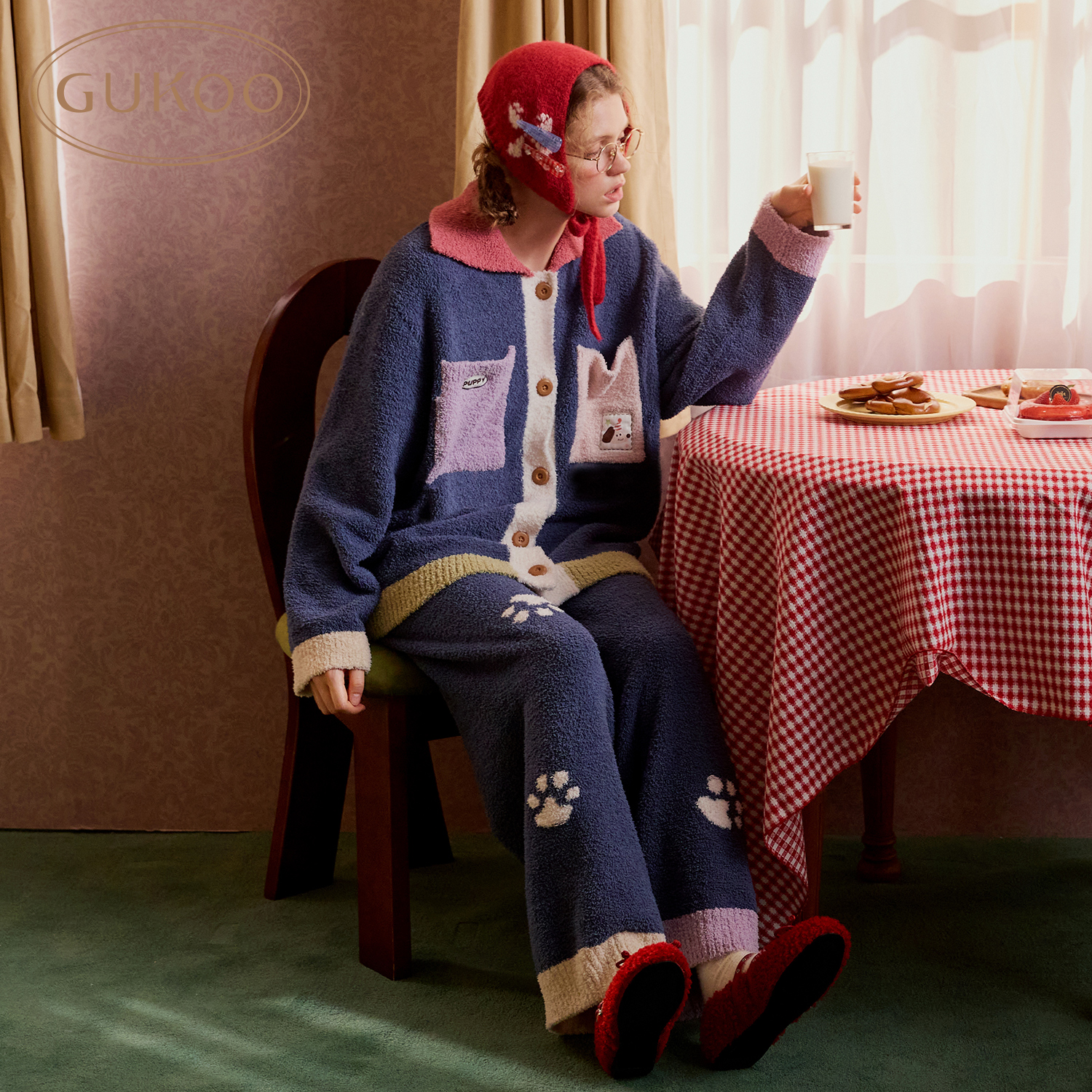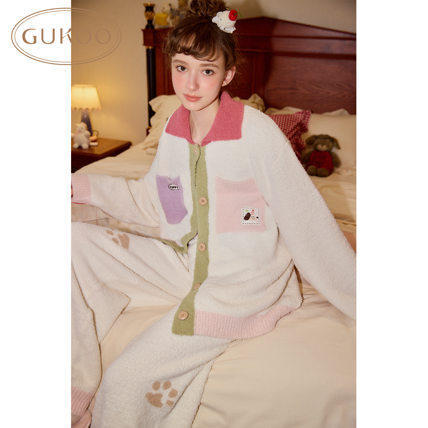轰轰小狗可爱女士家居服套装 半边绒保暖新款 果壳睡衣冬季 Gukoo