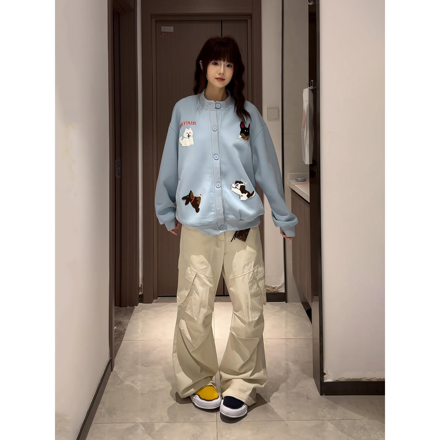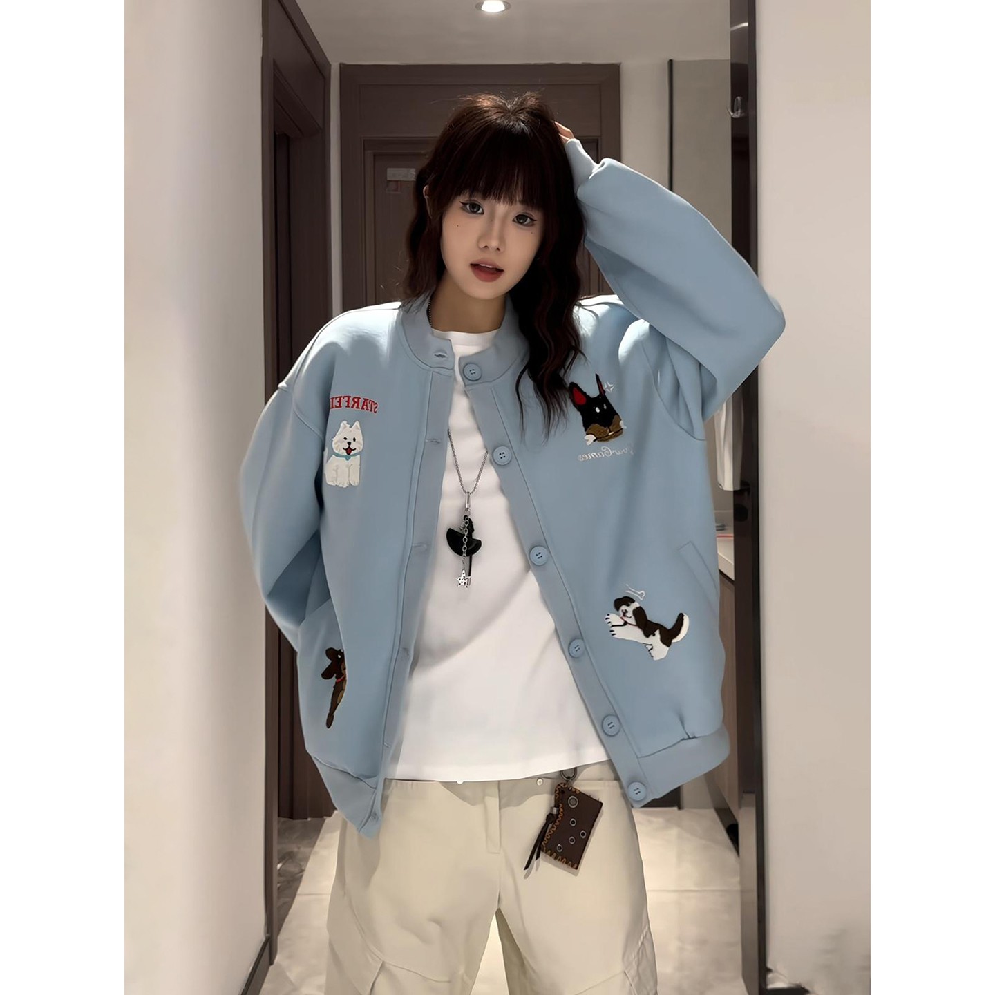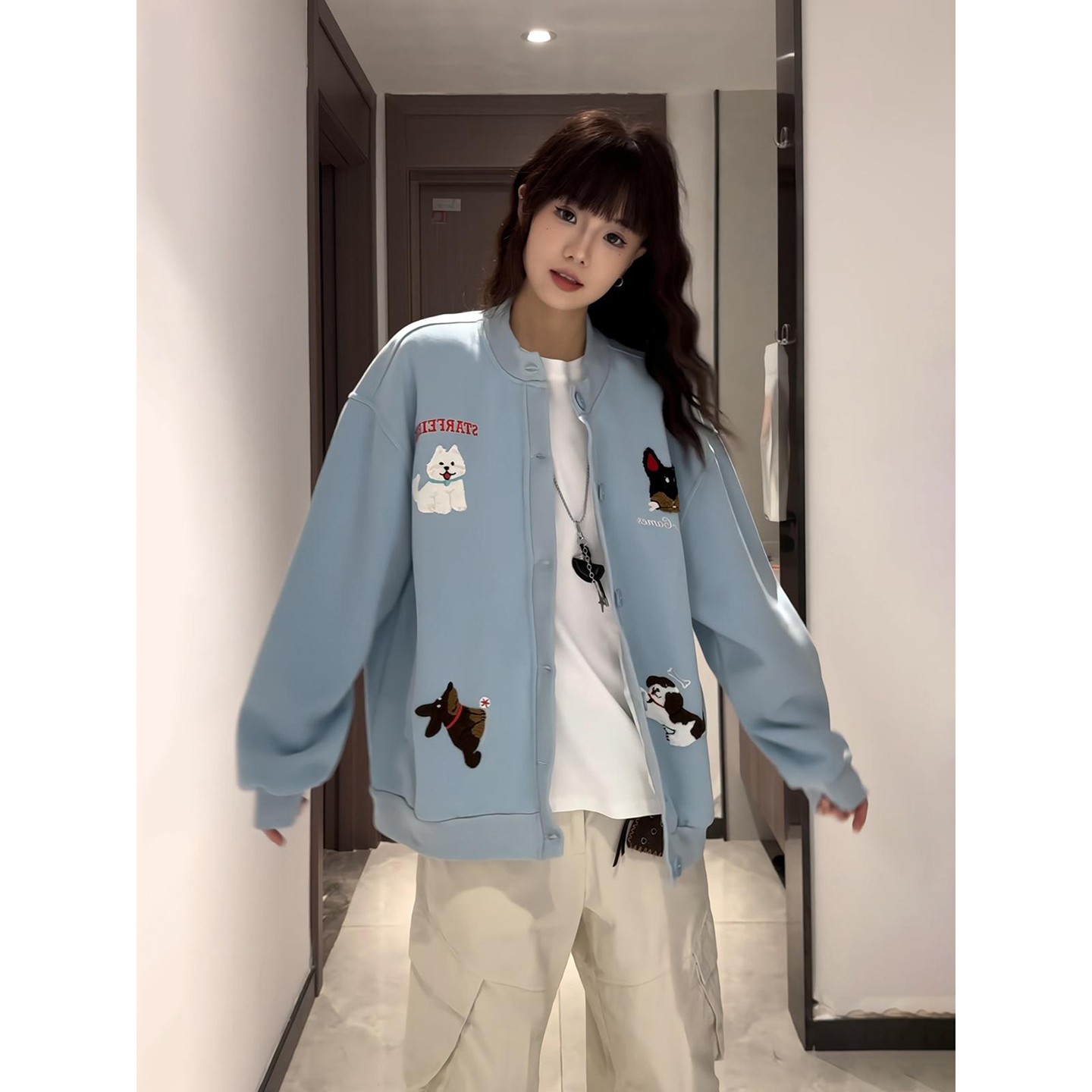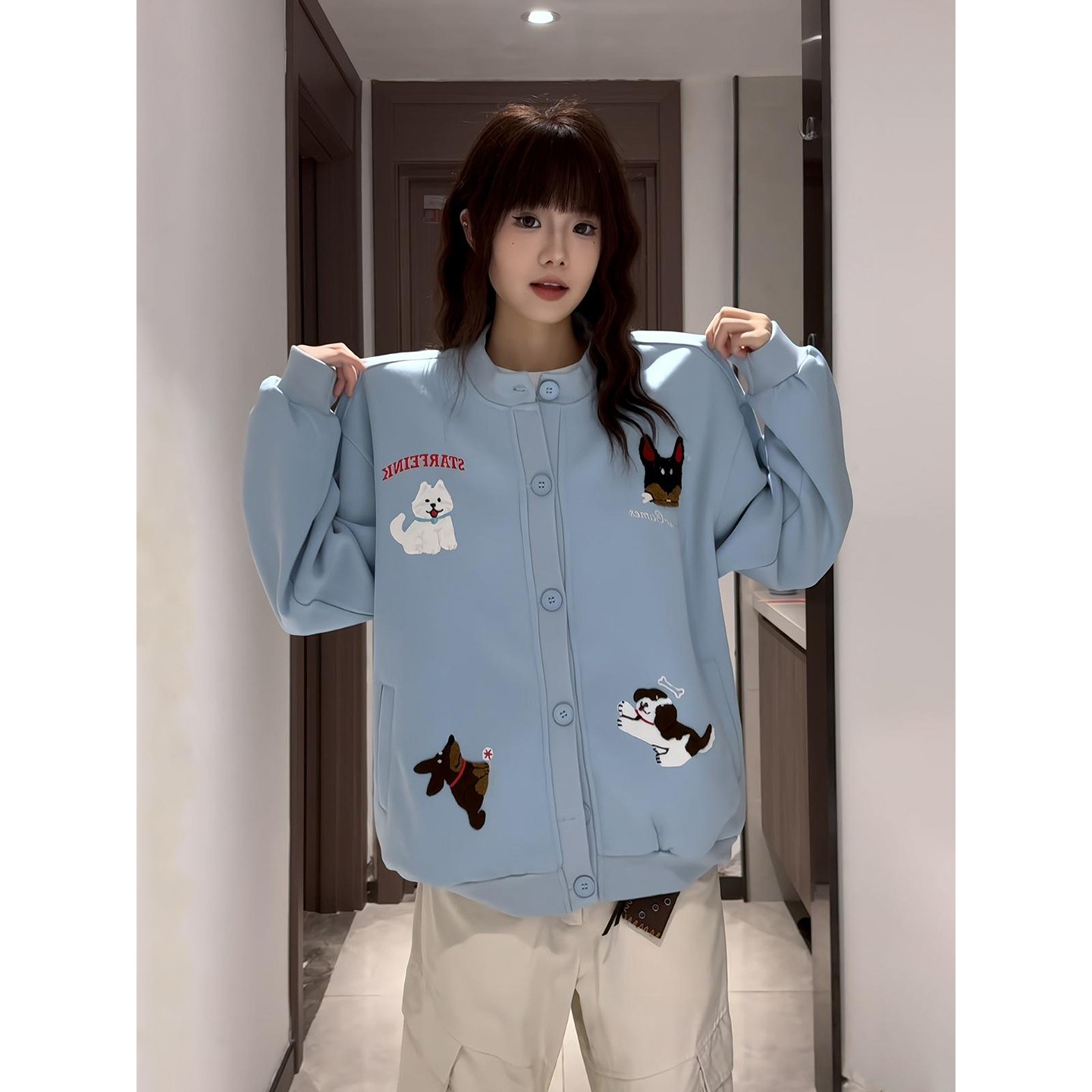 宽松慵懒风cleanfit情侣外套 卫衣男女秋季 美式 卡通小狗毛巾绣开衫