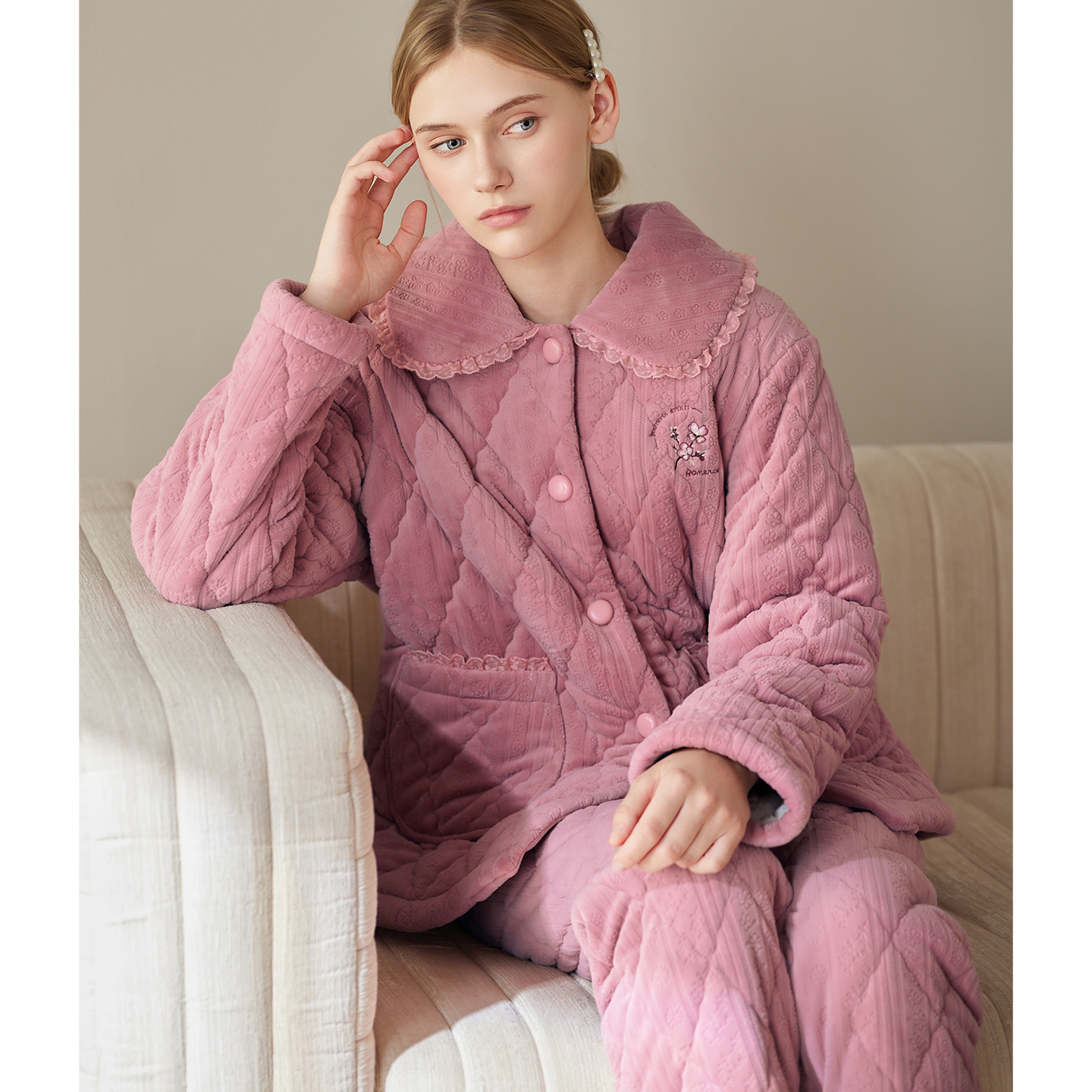 加绒抗静电家居服棉袄 女款 芬腾睡衣女冬季 三层加厚珊瑚绒夹棉套装