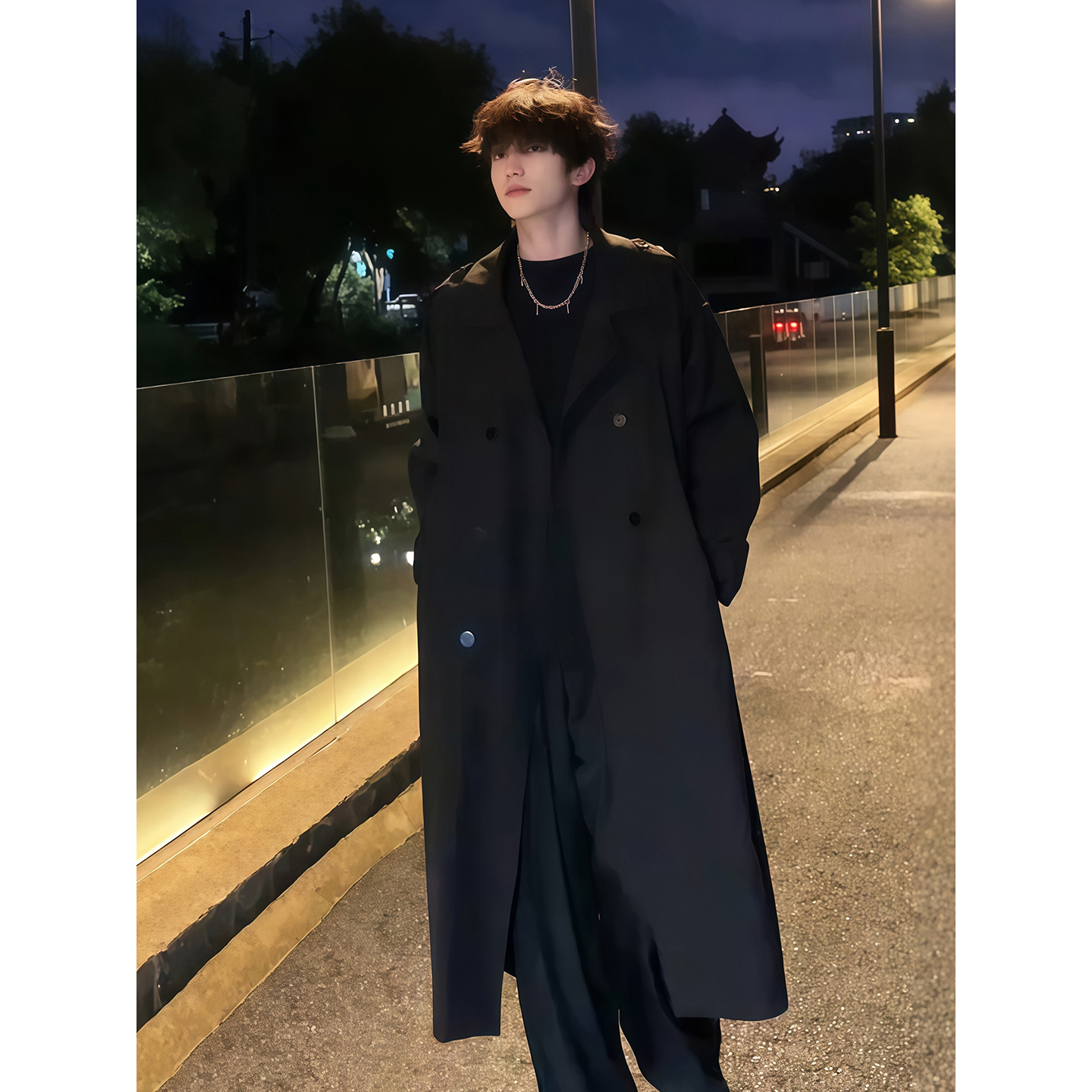 韩版 长款 呢子加厚风衣外套 2025春秋季 V37黑色高级感毛呢大衣男款