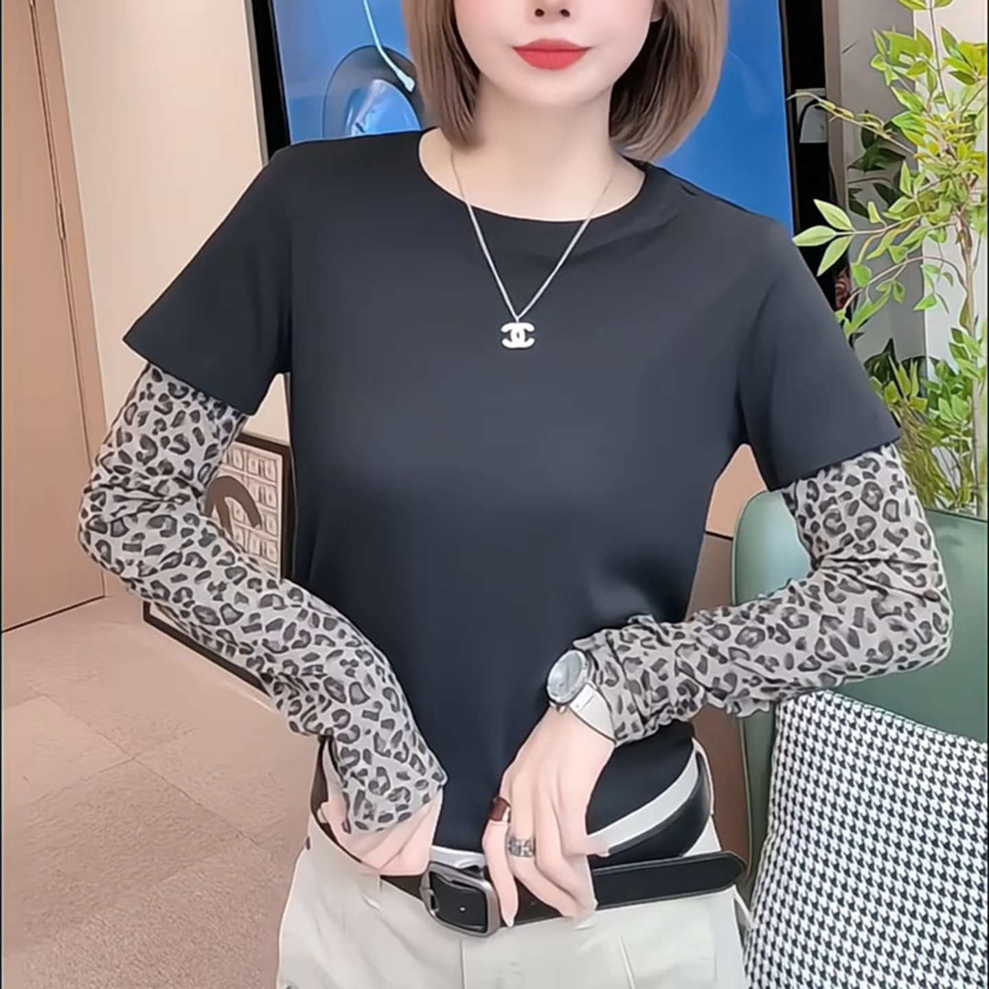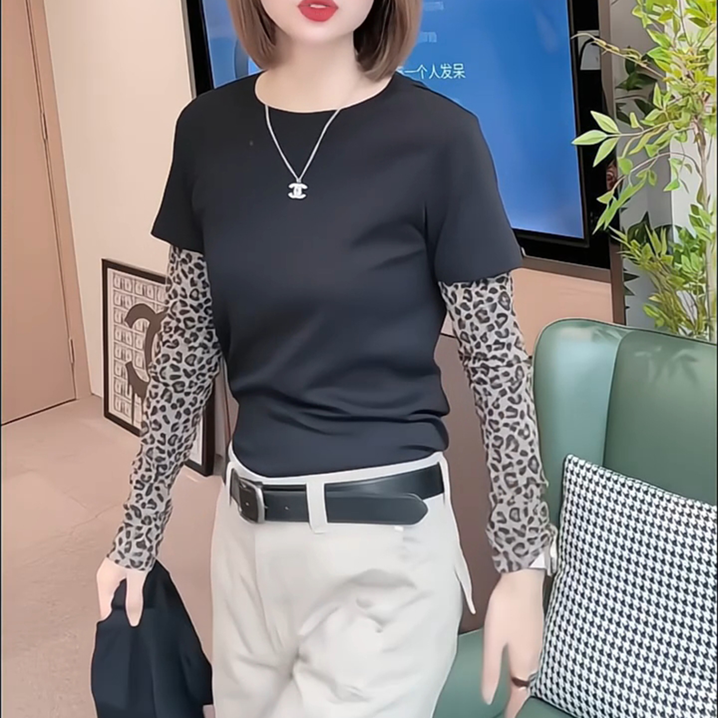 t恤女撞色假两件上衣打底衫 复古设计感小众豹纹长袖 新款 2025秋款