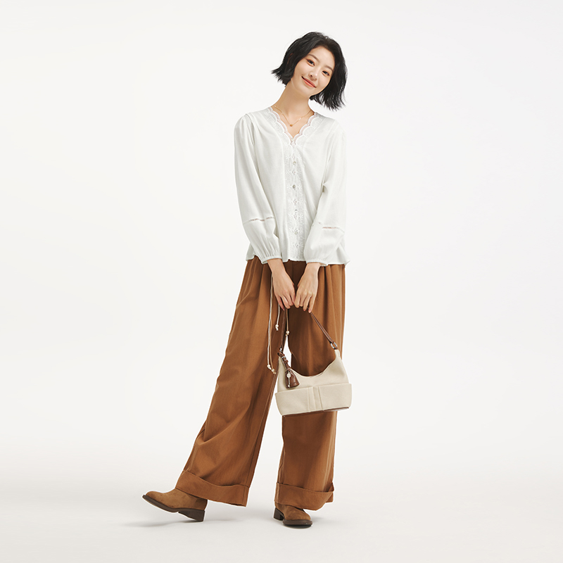女长袖 衬衫 18345220 佐丹奴褶皱肌理拼接蕾丝圆领宽松法式 设计师款