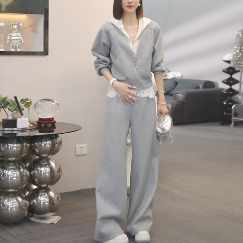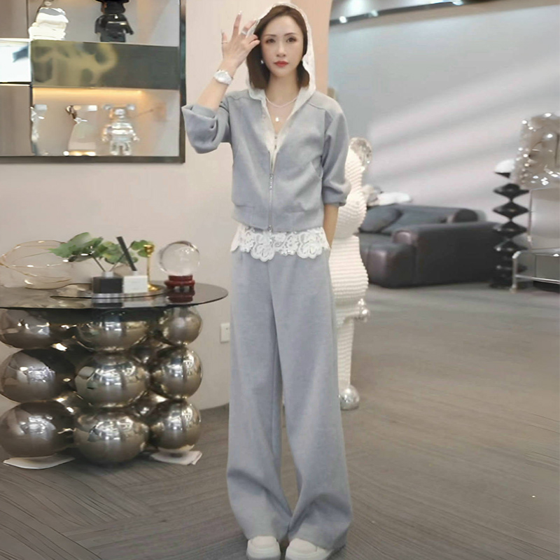 拉链卫衣休闲裤 高级拼接蕾丝遮肚子连帽薄款 两件套 女2025韩版 套装