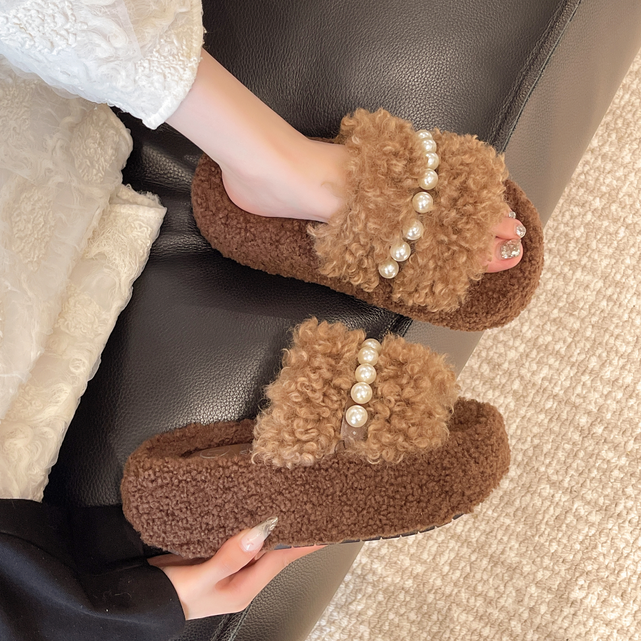 松糕厚底增高气质一字女棉拖鞋 外穿2025新款 女秋冬季 洋气毛毛拖鞋