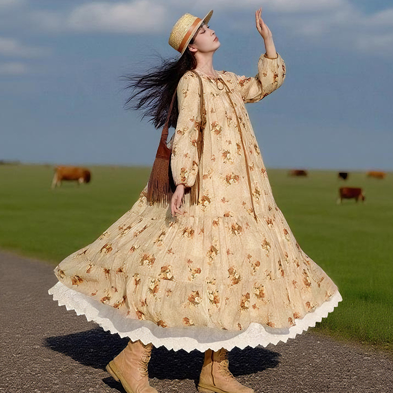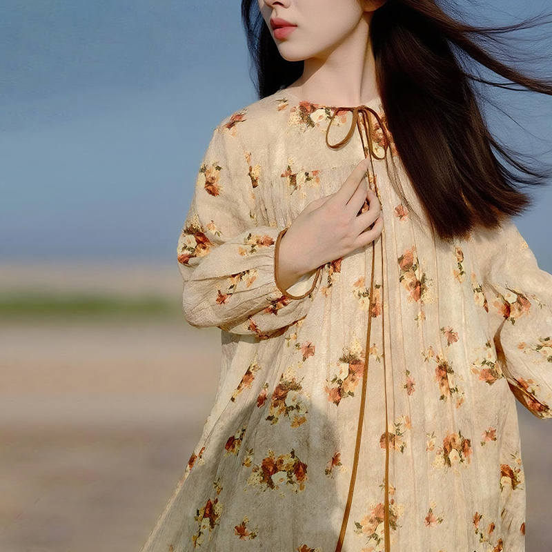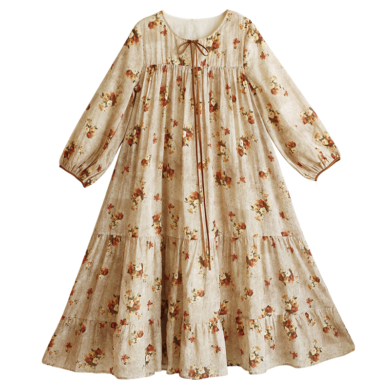 秋水伊人法式 清仓 复古V领雪纺印花连衣裙秋显瘦裙子 奥莱断码