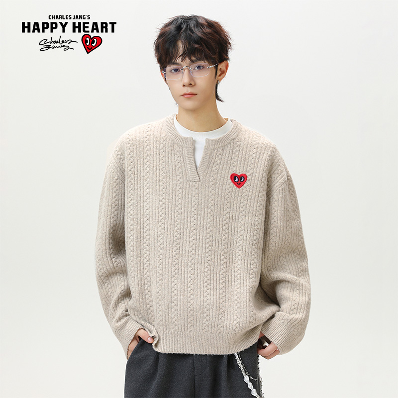 毛衣男 针织V领情侣慵懒套头纹理感休闲长袖 查尔斯桃心秋冬季 新款