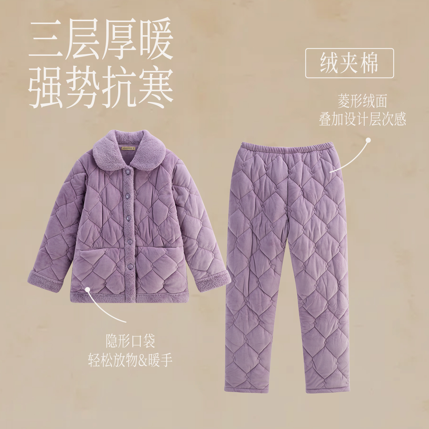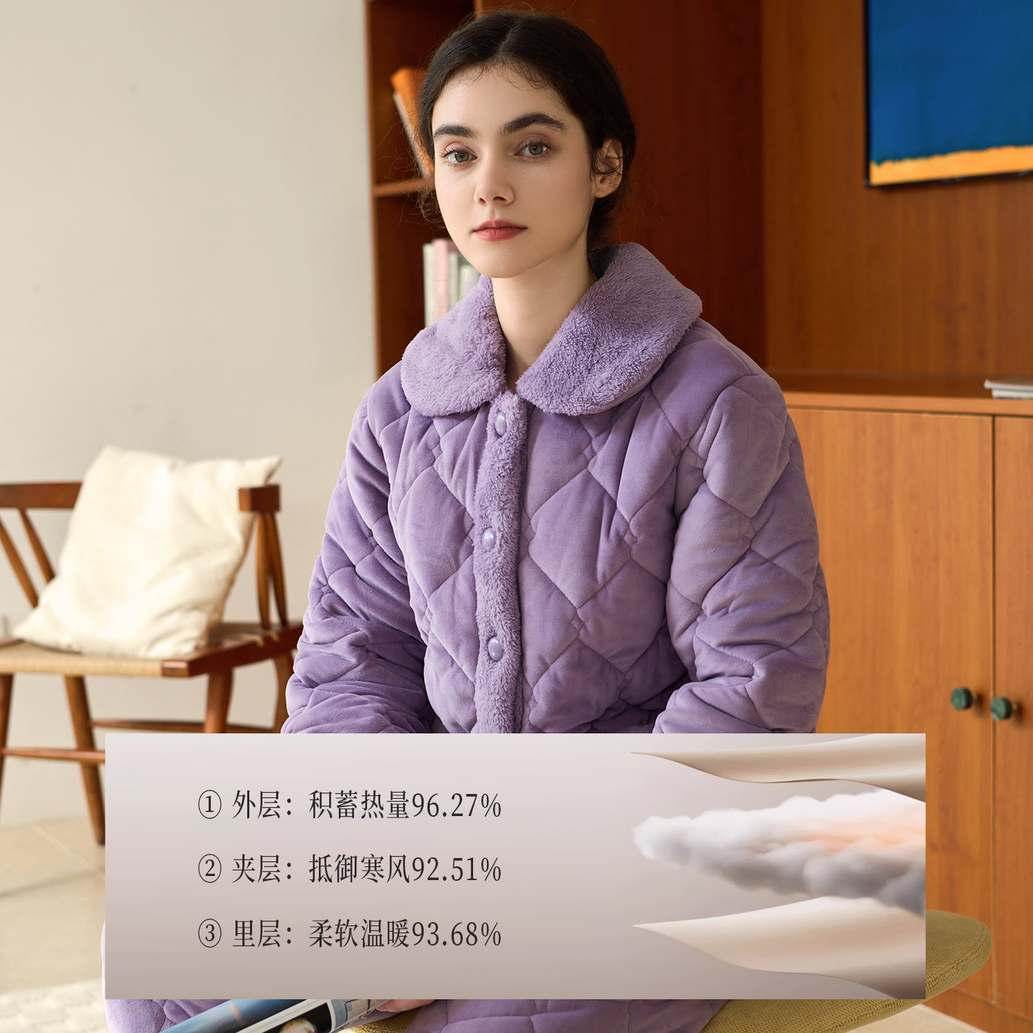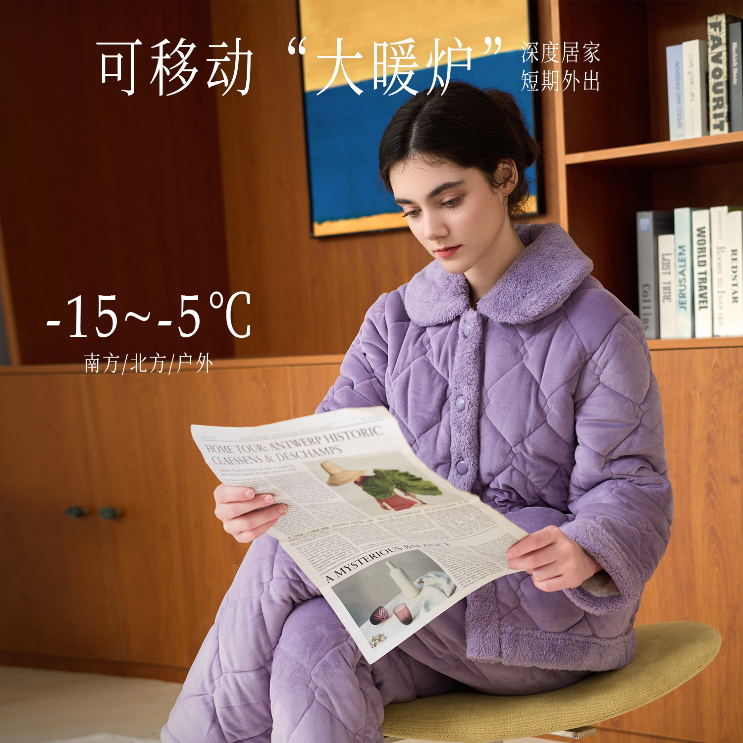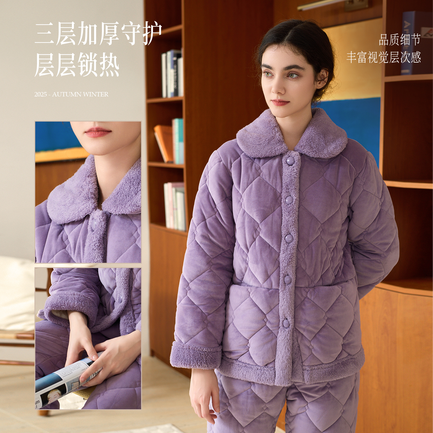 澳毛绒三层夹棉翻领加厚保暖可外穿家居服套装 秋鹿睡衣女款 秋冬季
