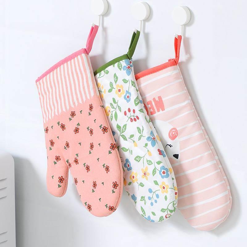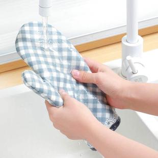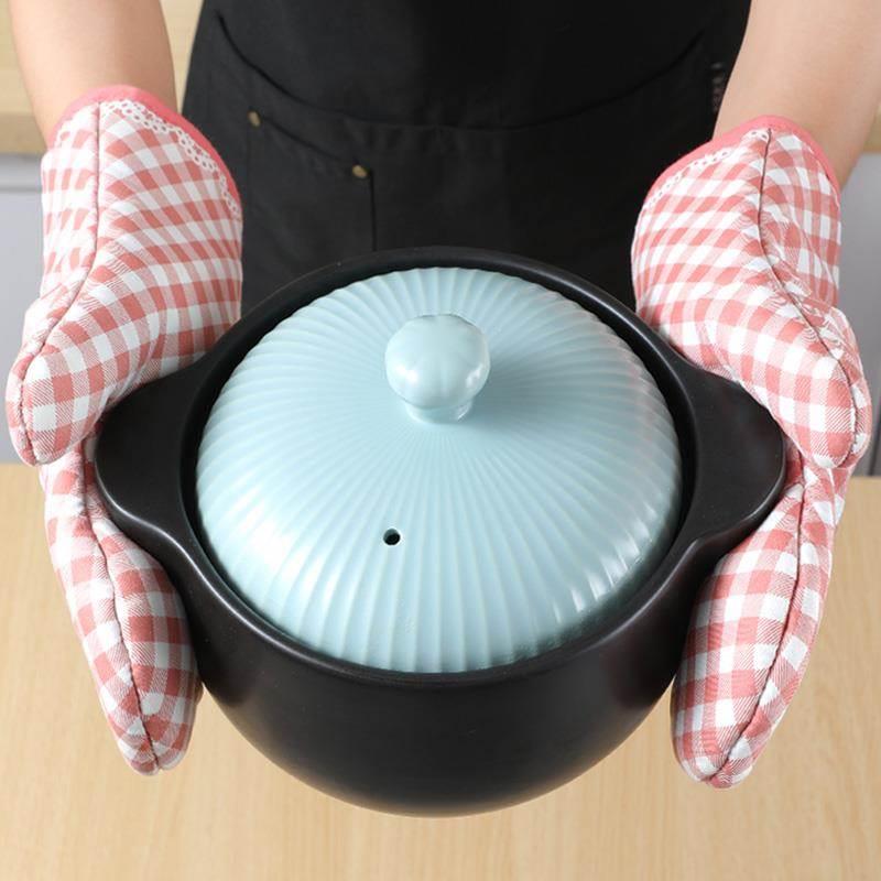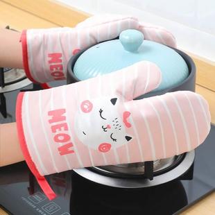 韩风粉色格子加棉糖针硅胶手套家用防滑耐热微波炉手套防烫隔热厚
