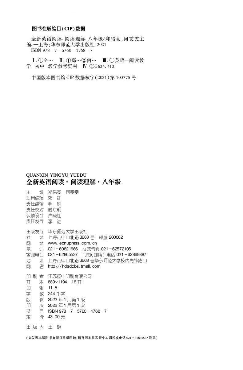 社 华东师范大学出版 全新英语阅读八年级阅读理解 8年级英语阅读专项训练书籍初中生初二英语课外辅助提高读物