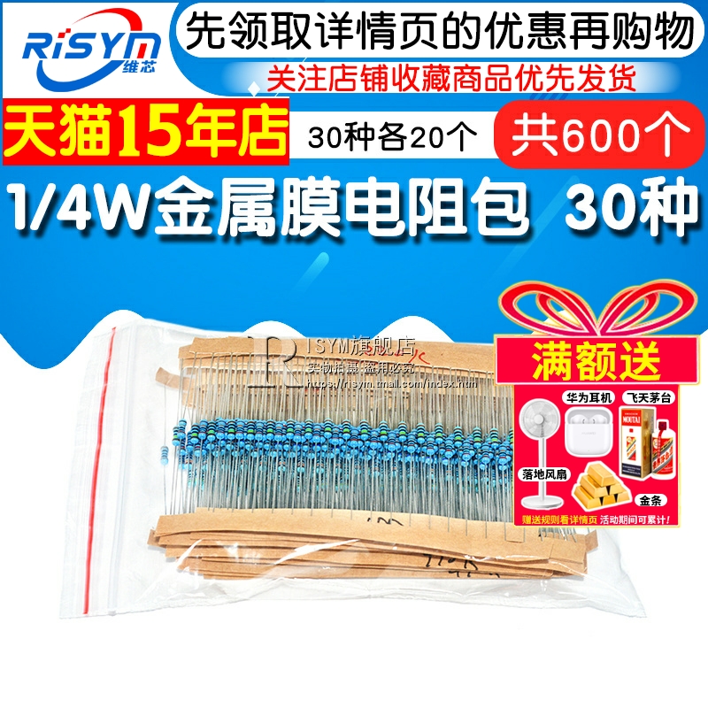 件 1%五色环电阻器元 30种常用每种20个共600个 4W金属膜电阻包
