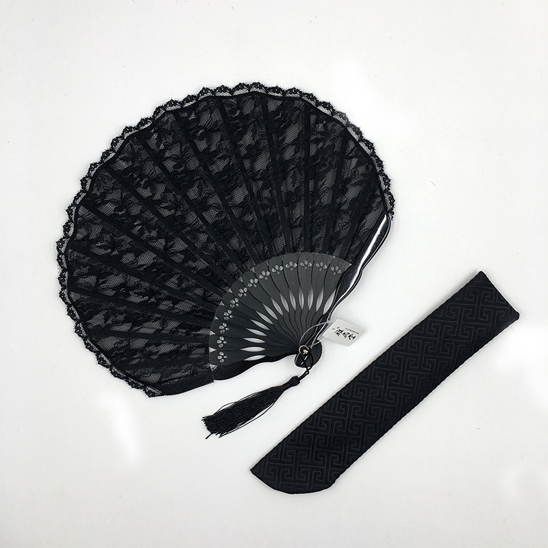 古典绣花蕾丝折扇女式 折叠旗袍扇舞蹈古风黑色扇子便携小圆扇夏天