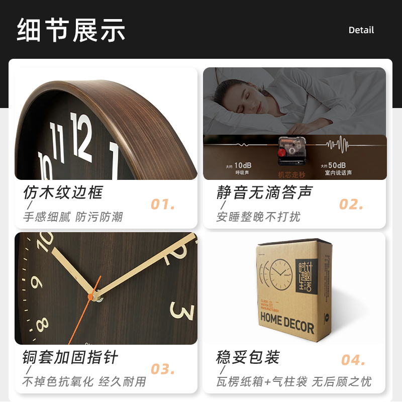 方形圆形日式 饰静音时钟现代石英钟挂表 钟表木纹挂钟创意客厅装