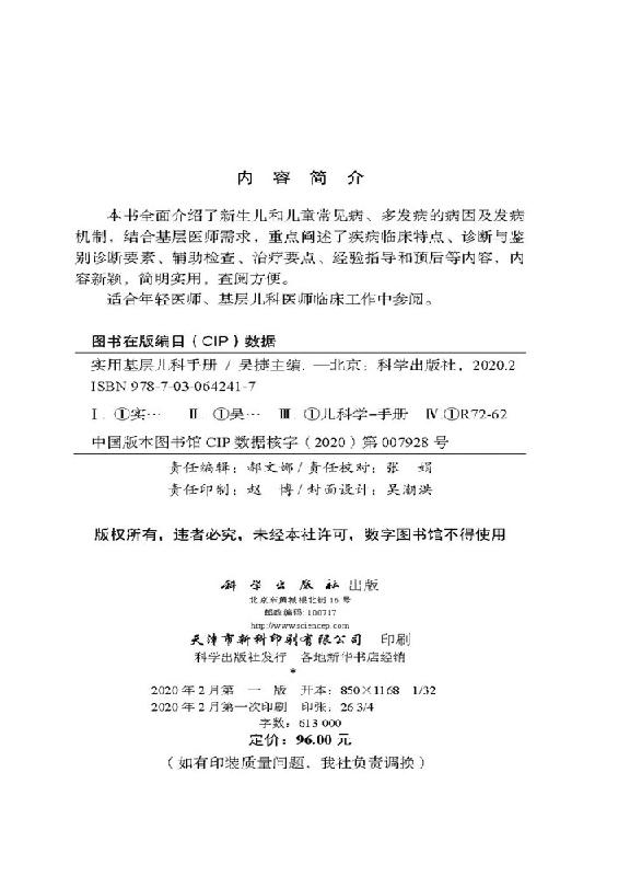 治疗要点 经验指导和预后等内容 吴捷编著 实用基层儿科手册 科学出版 诊断与鉴别诊断要素 9787030642417 社 疾病临床特点
