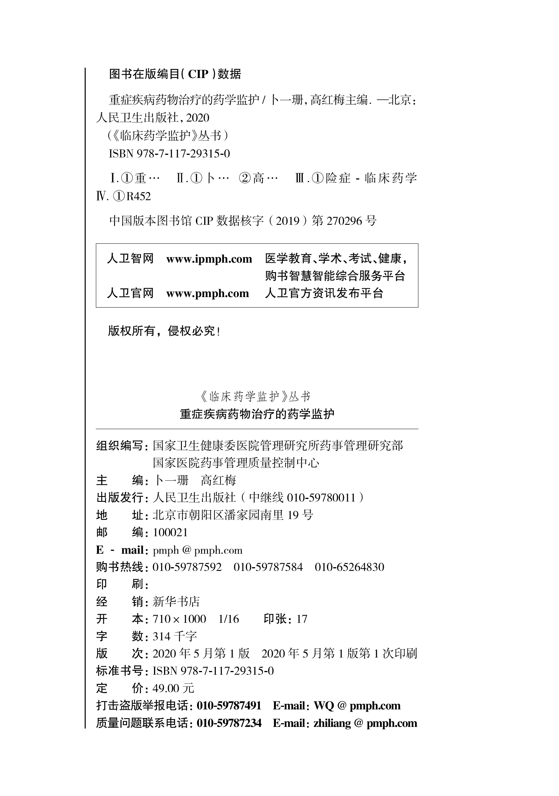 主编 重症疾病药物治疗 卜一珊 正版 人民卫生出版 患者用药教育 临床药学监护 药学监护措施 药学监护 监测与防范 丛书 社 高红梅
