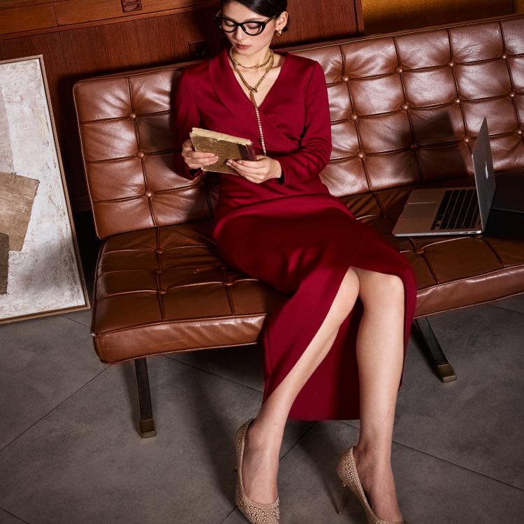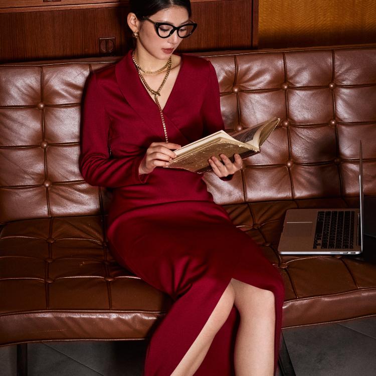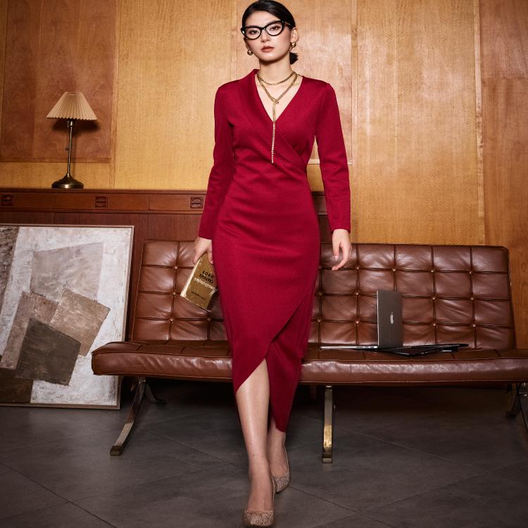 菲梦伊原创钉珠红色连衣裙女秋季 贵妇高档大气轻熟气质中长裙 新款