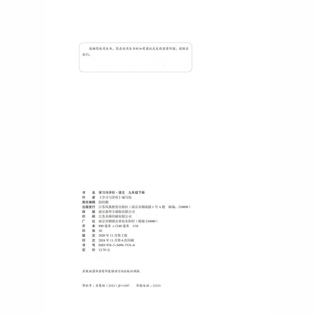 9下 江苏中学同步教辅材料 配部编版 2025年春 江苏凤凰教育出版 语文九年级下册 含参考答案 社 学习与评价