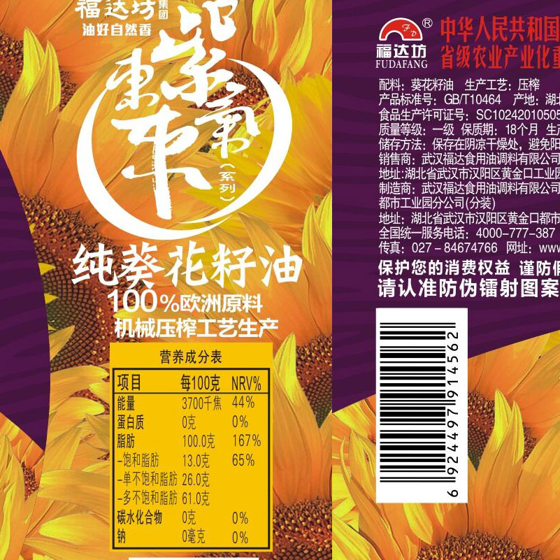 多力葵花籽油食用油1.8L科学去壳压榨家用好油 营养清淡少油烟