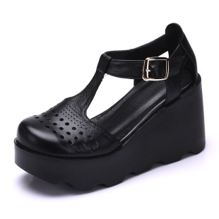 女鞋 典缀新款 厚底防水台包头中空透气高跟鞋 女凉鞋 女 镂空真皮夏季