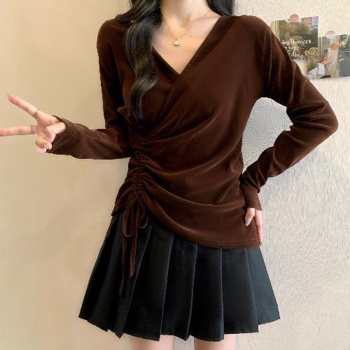 t恤1010z 女胖mm显瘦遮肚v领长袖 秋冬独漂亮金丝绒打底衫 2025大码
