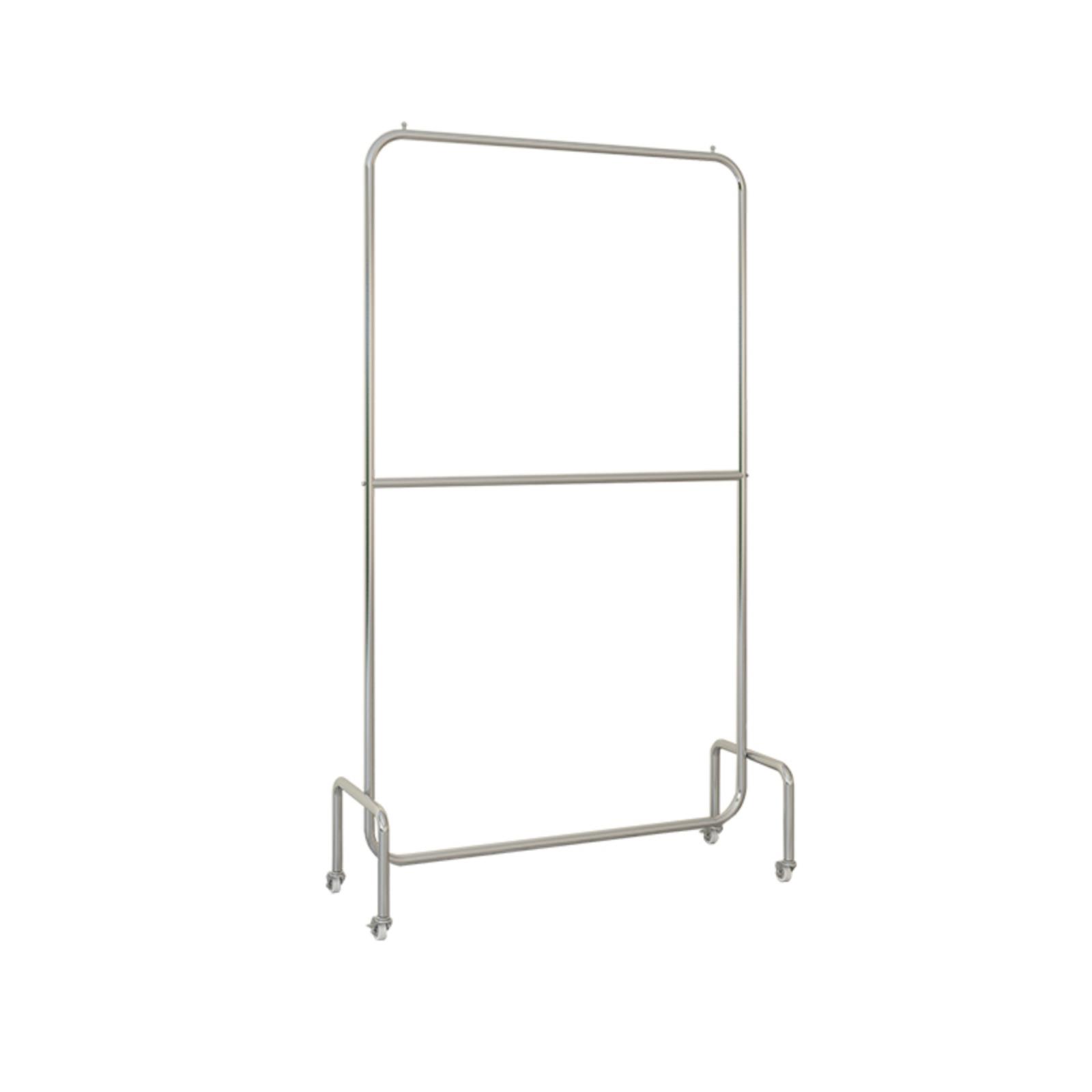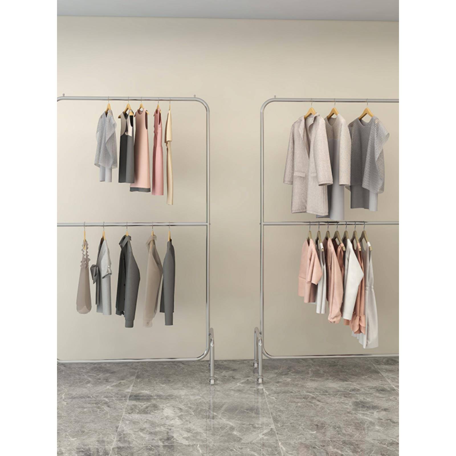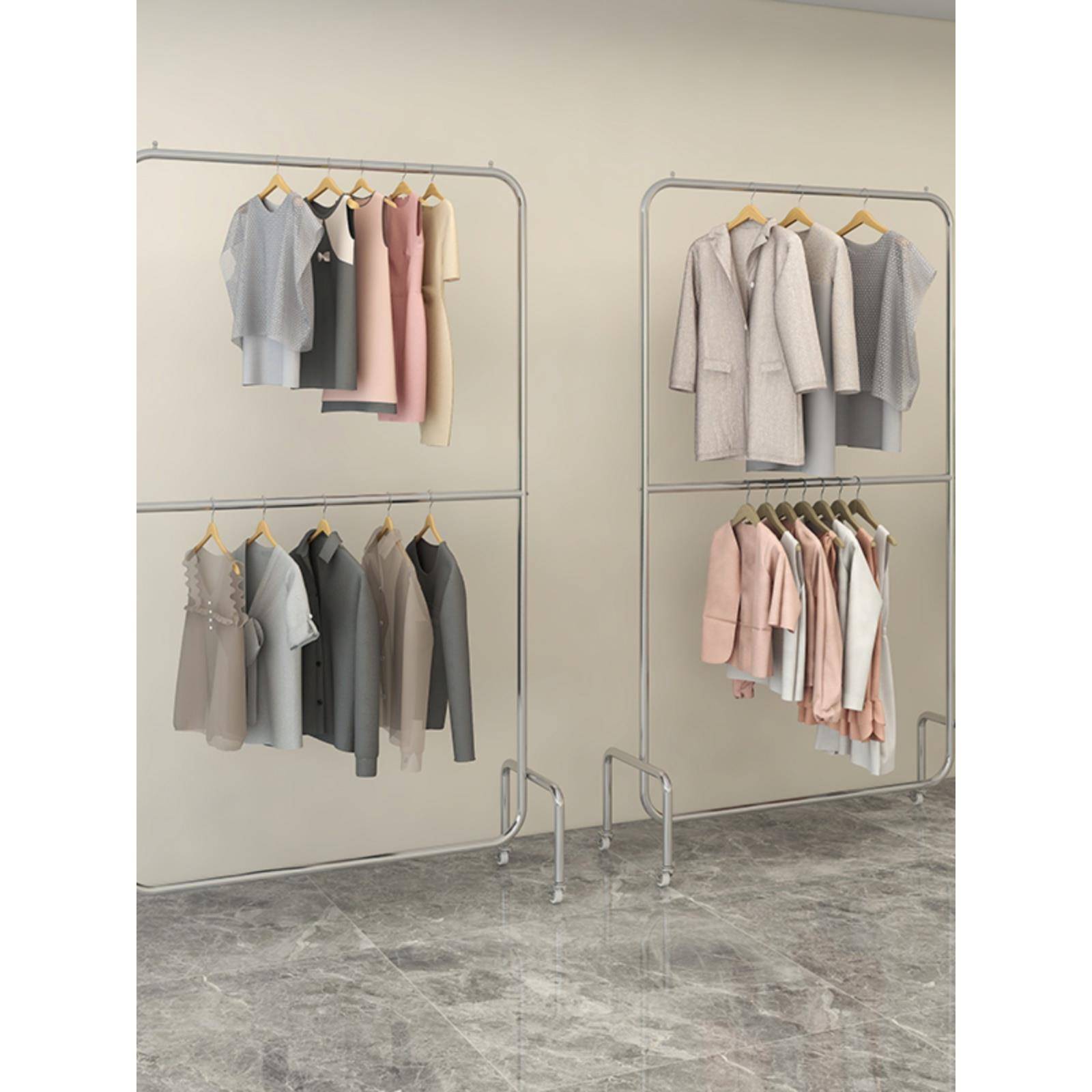 店带轮货架 双层可调节挂衣杆女装 服装 店展示架不锈钢拉丝银落地式