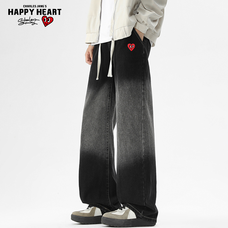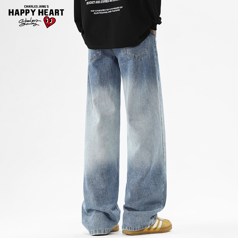 复古磨白宽松直筒加绒休闲裤 美式 子 男秋冬季 查尔斯桃心渐变牛仔裤
