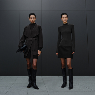 娅丽达松紧腰羊毛醋酸半身裙女秋冬2025新款 黑色裙子开叉直筒长裙