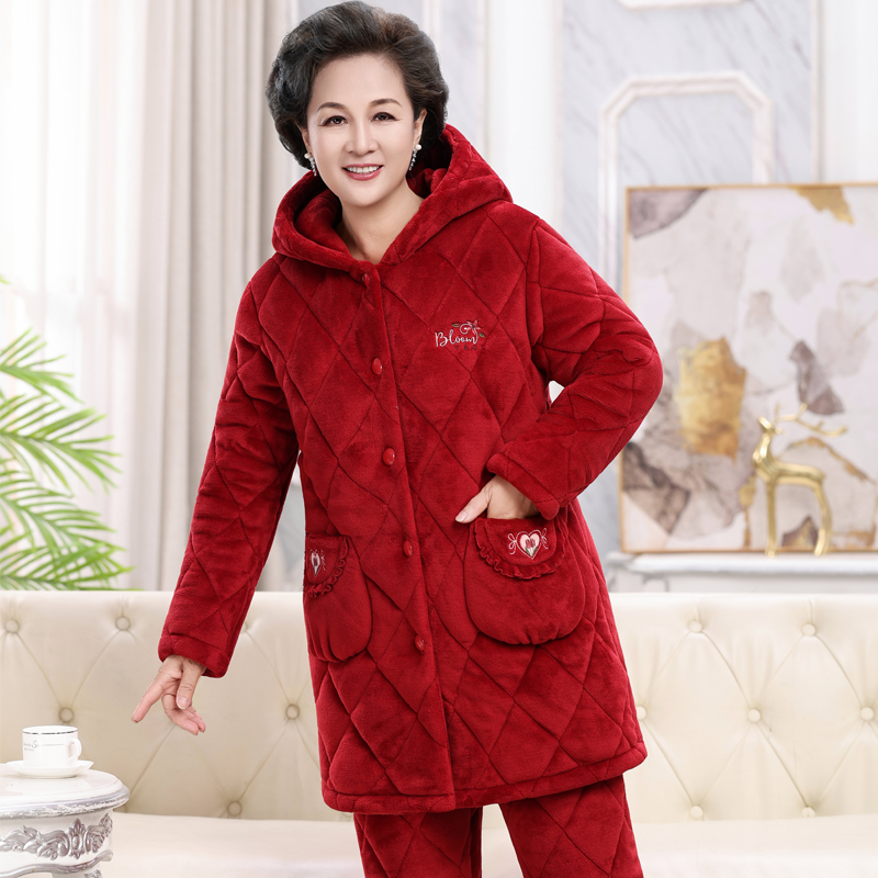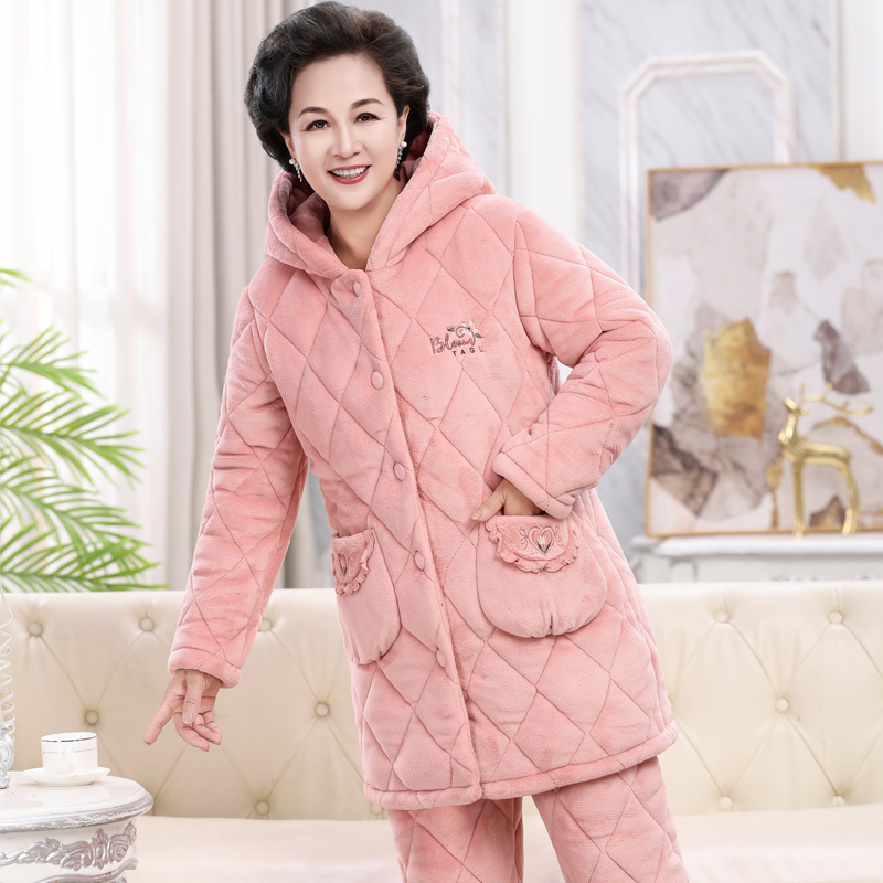 加长款 睡衣女三层夹棉加厚珊瑚绒中老年人加绒保暖妈妈 连帽秋冬季