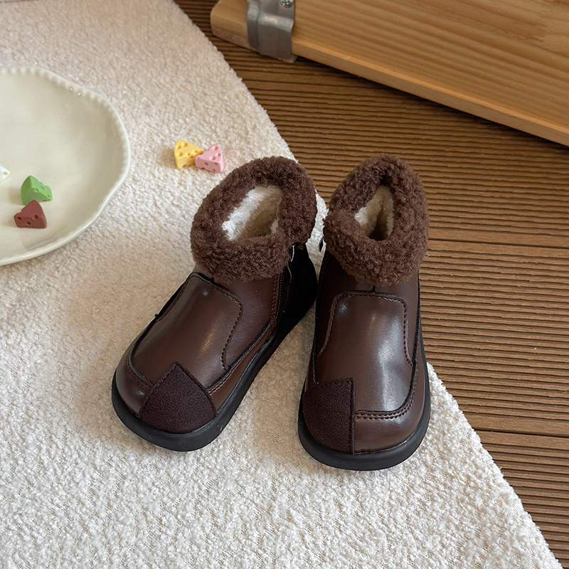 女童皮靴加绒保暖拼接英伦风2025冬季 女宝短靴中大童公主棉靴 新款
