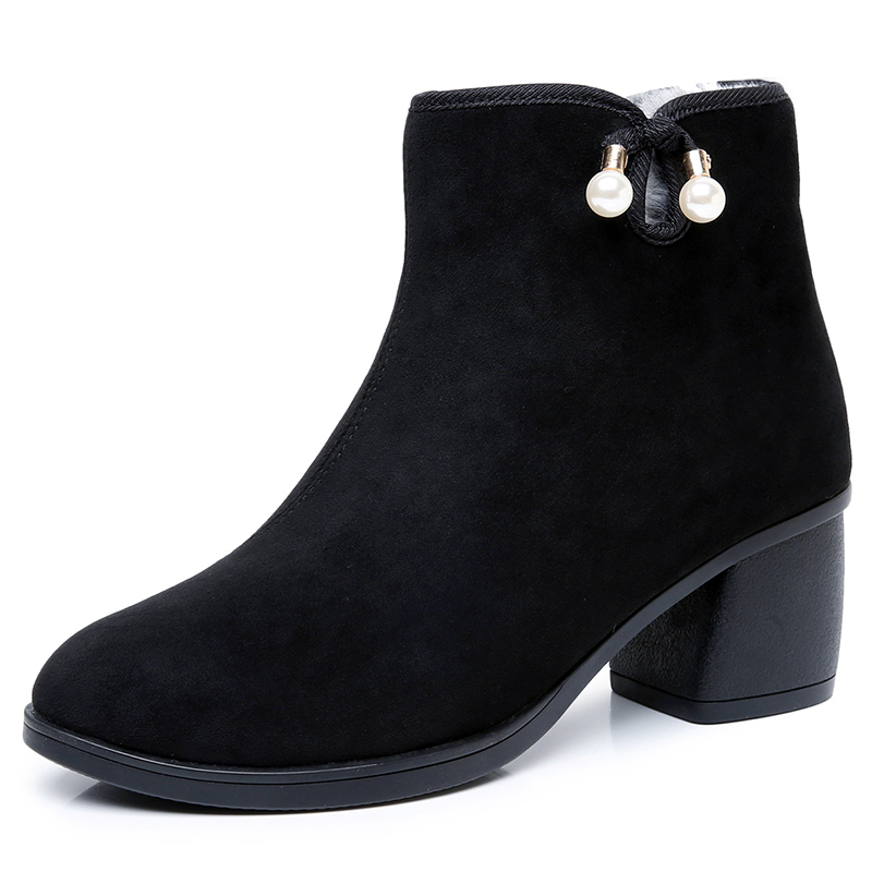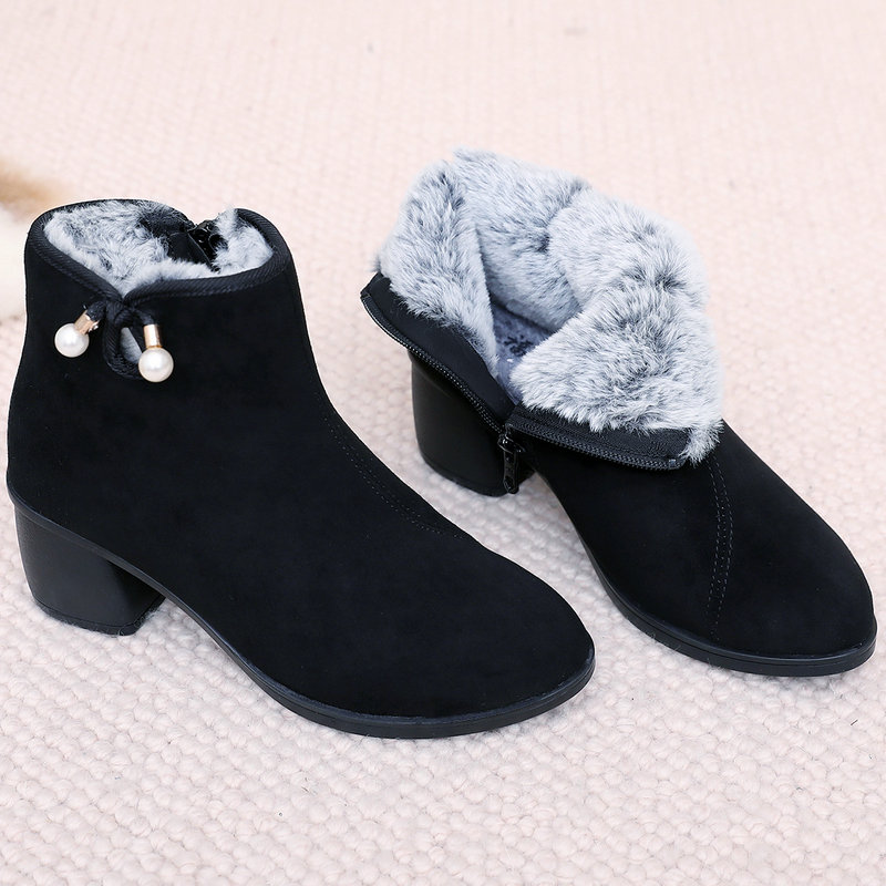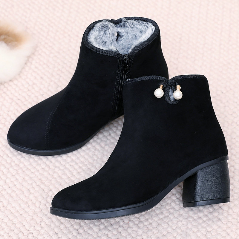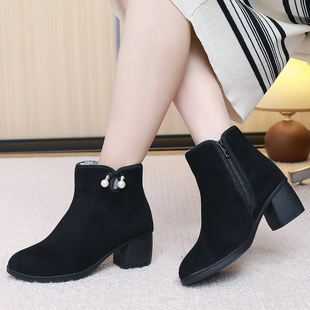 国风百搭妈妈高跟鞋 女靴绒面棉靴加绒中跟短靴子保暖时尚 新款 冬季