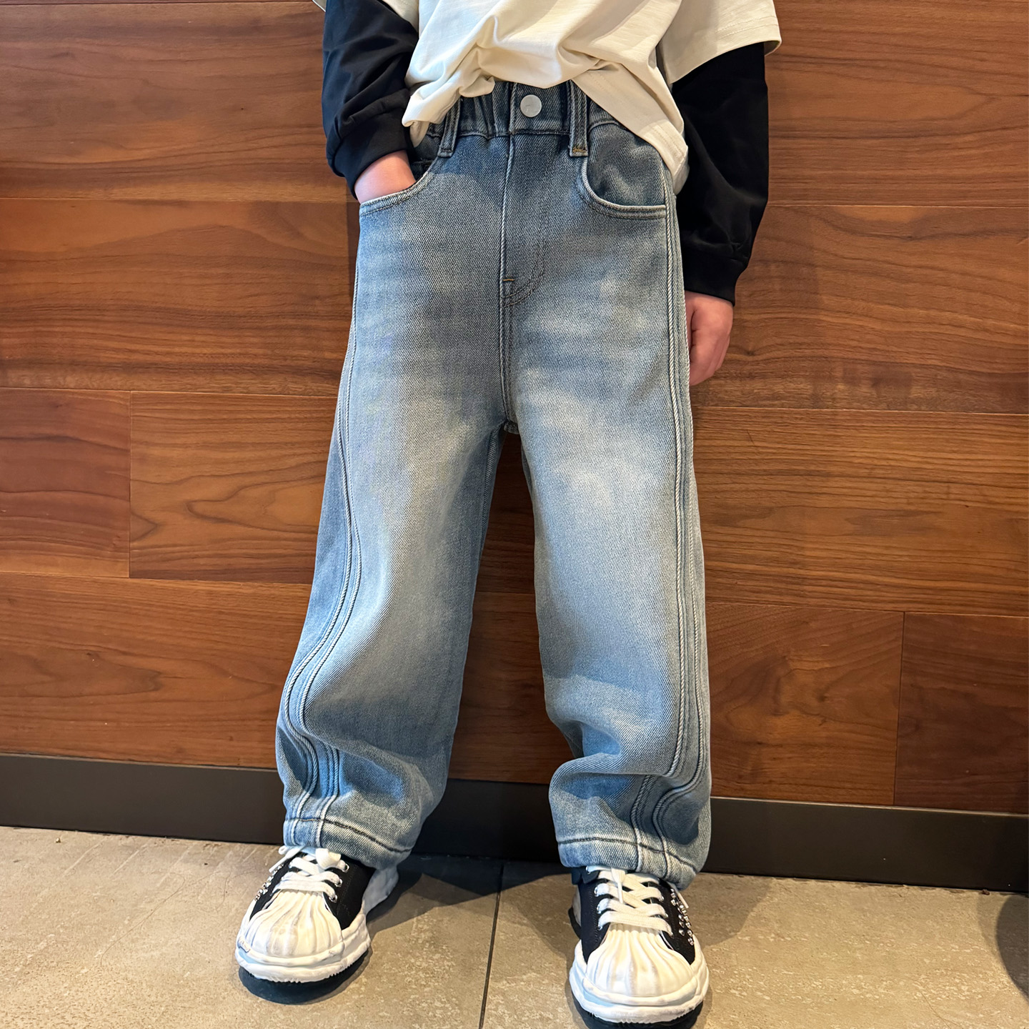 潮流宝宝儿童长裤 子2025冬浅蓝新品 男女童阔腿直筒加绒牛仔裤 童装