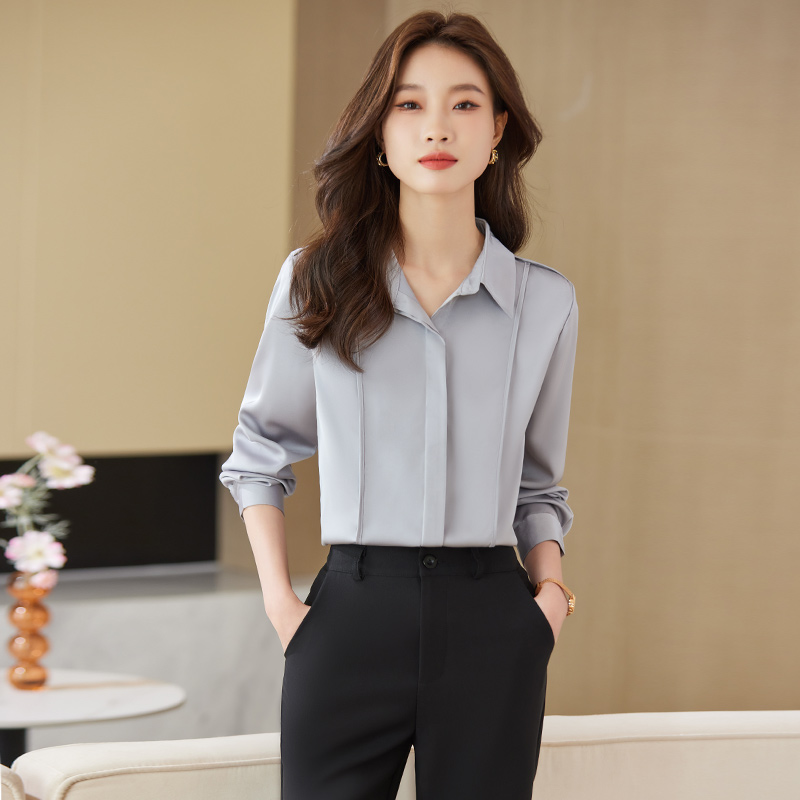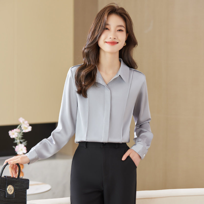 小众 女气质缎面设计感职业通勤灰色衬衣垂顺秋季 气质咖色长袖 衬衫