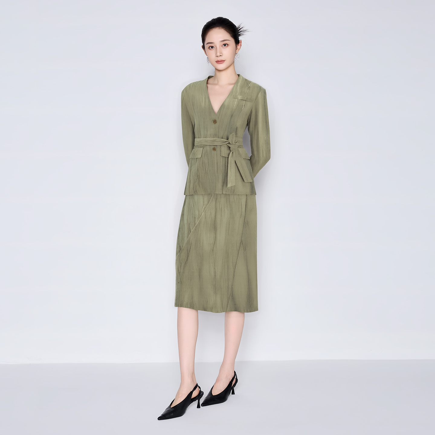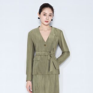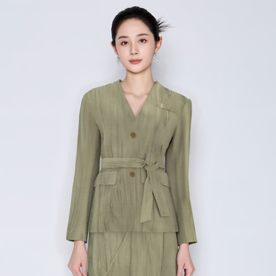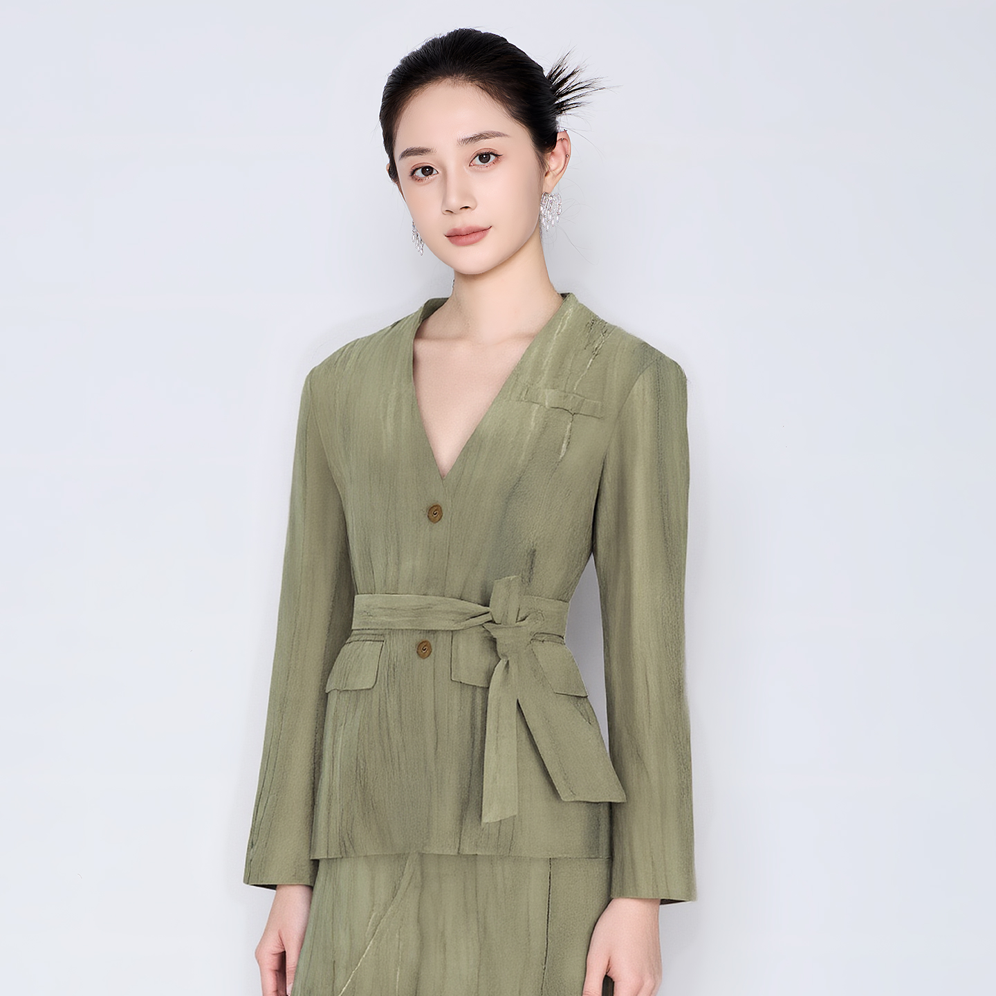 马天奴2025秋冬新款 西服老钱风腰带 甘草绿印花V领单排扣外套西装