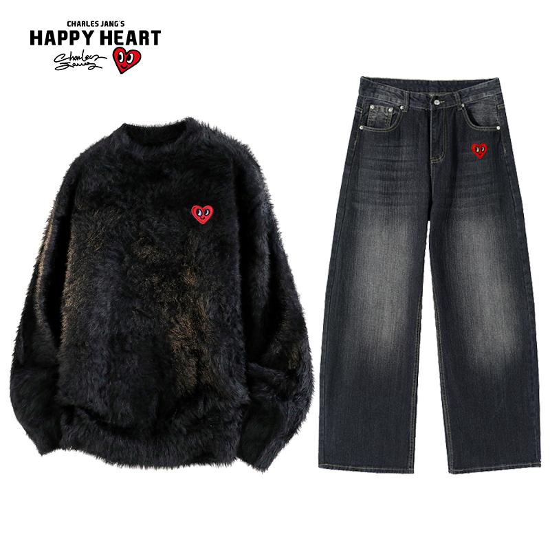 水洗牛仔裤 休闲套装 两件套 情侣加绒保暖圆领针织衫 查尔斯桃心冬季