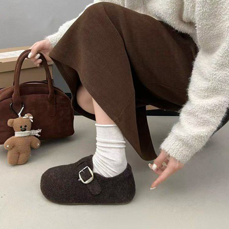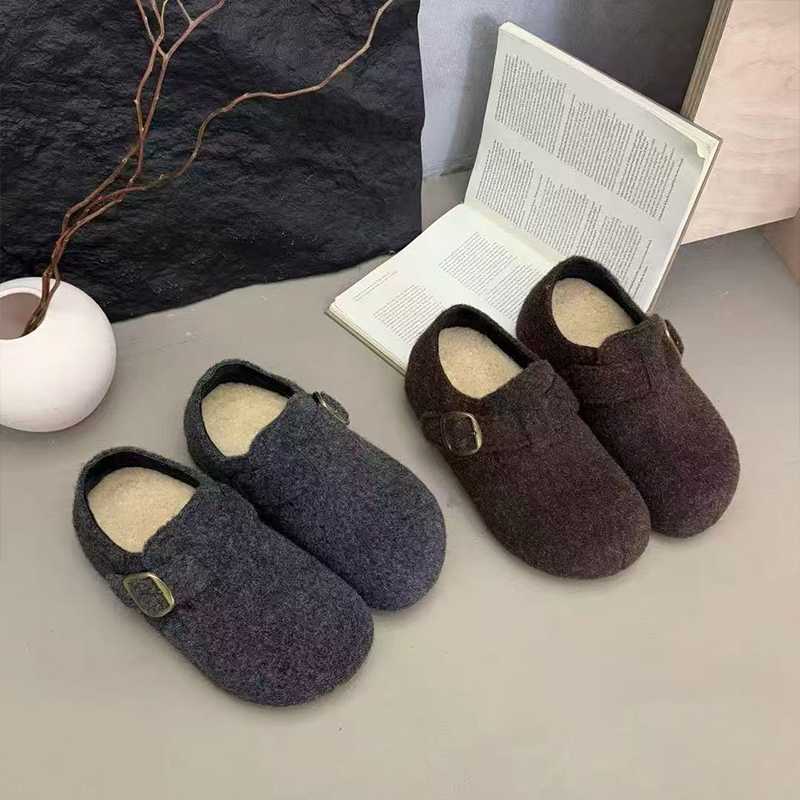 女2025秋冬季 厚底单鞋 新款 毛毛鞋 保暖棉鞋 内增高毛呢料加绒勃肯鞋