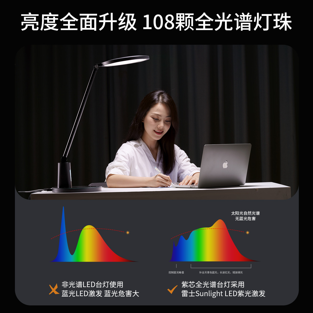 雷士照明黑色护眼台灯学习专用学生宿舍卧室床头灯儿童书桌阅读灯
