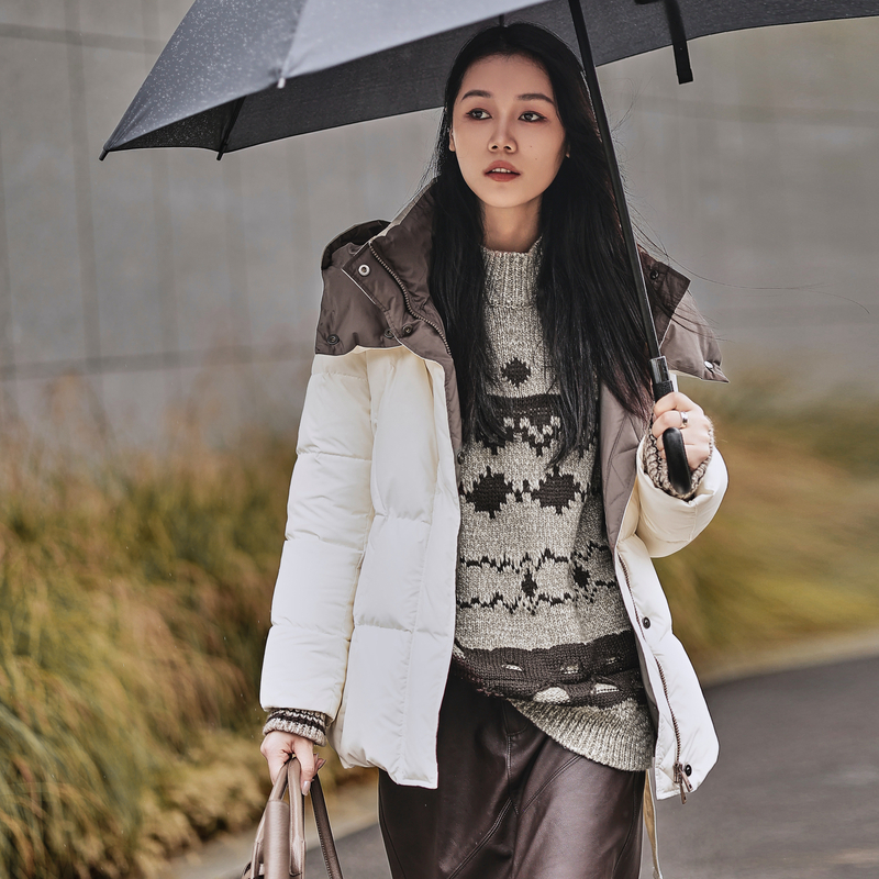 连帽设计外套女装 XG雪歌米白色长袖 中长款 新款 鹅绒羽绒服2025冬季