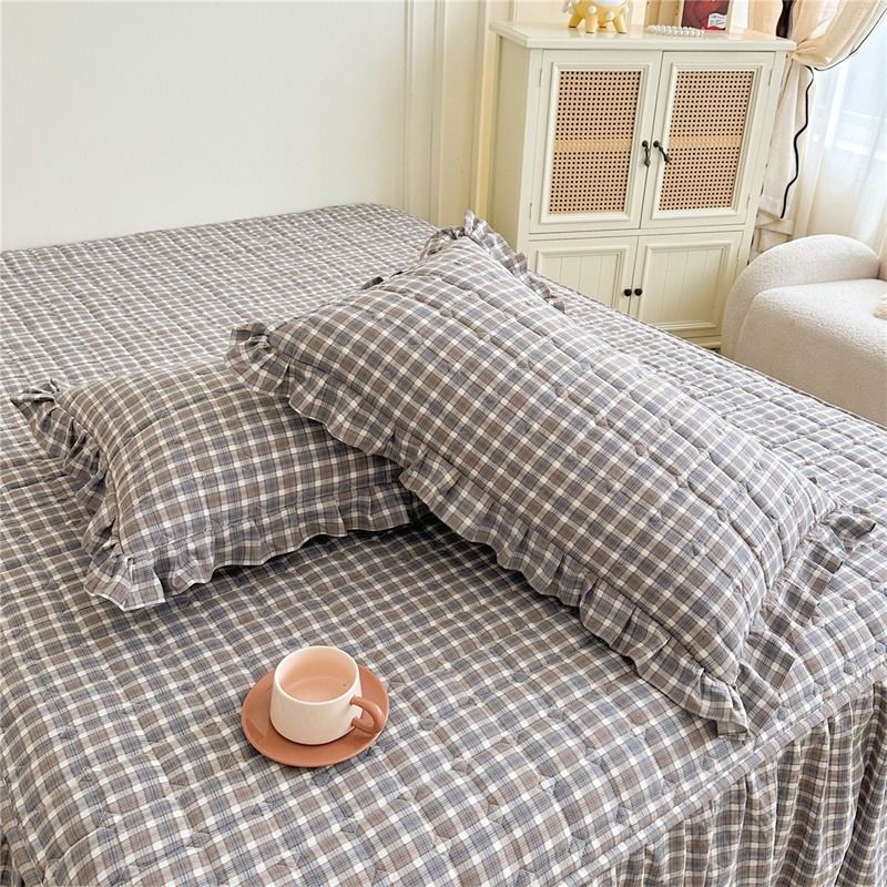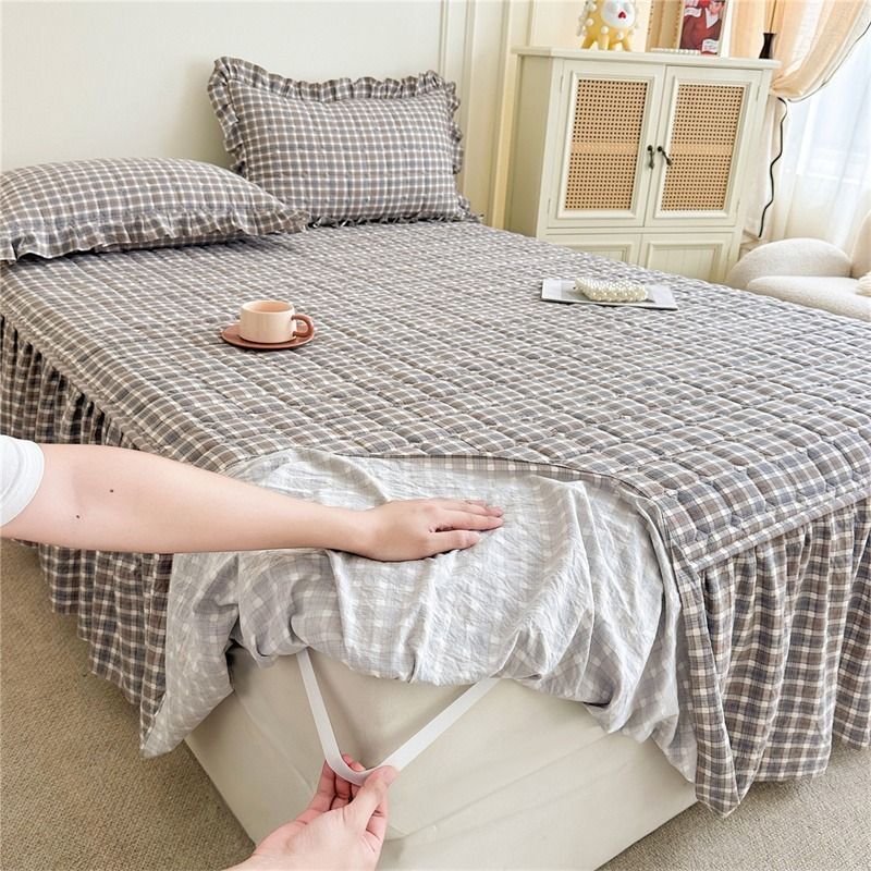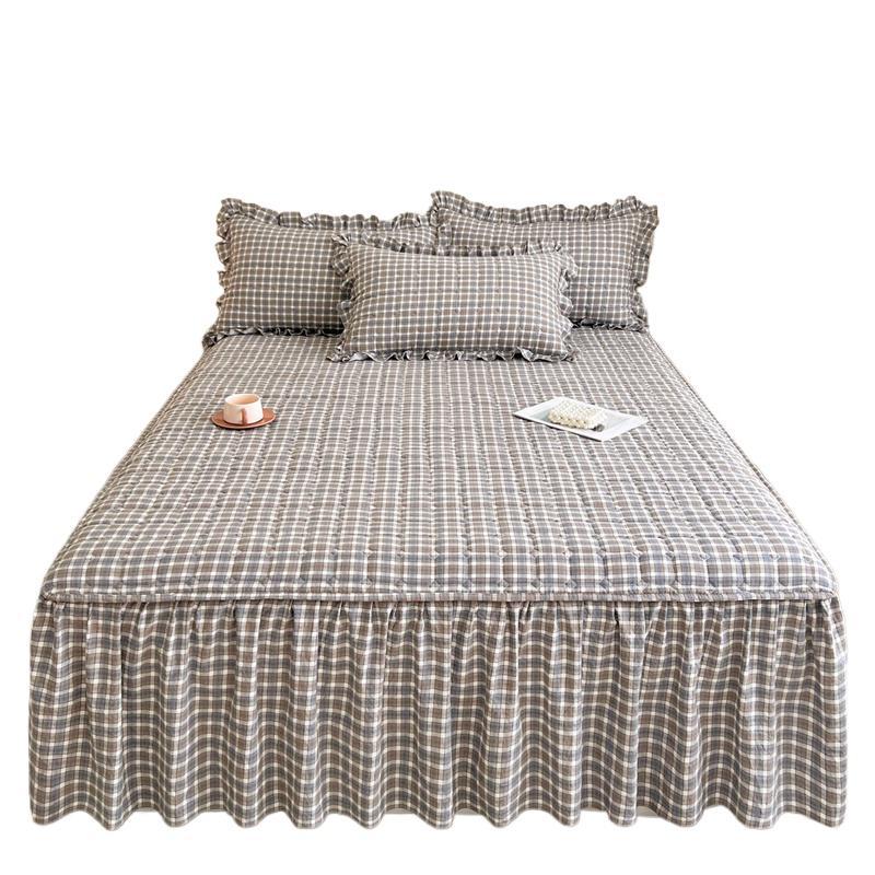 秋冬加厚磨毛夹棉格小格床裙枕套三件套简约少女心花边床罩两件套