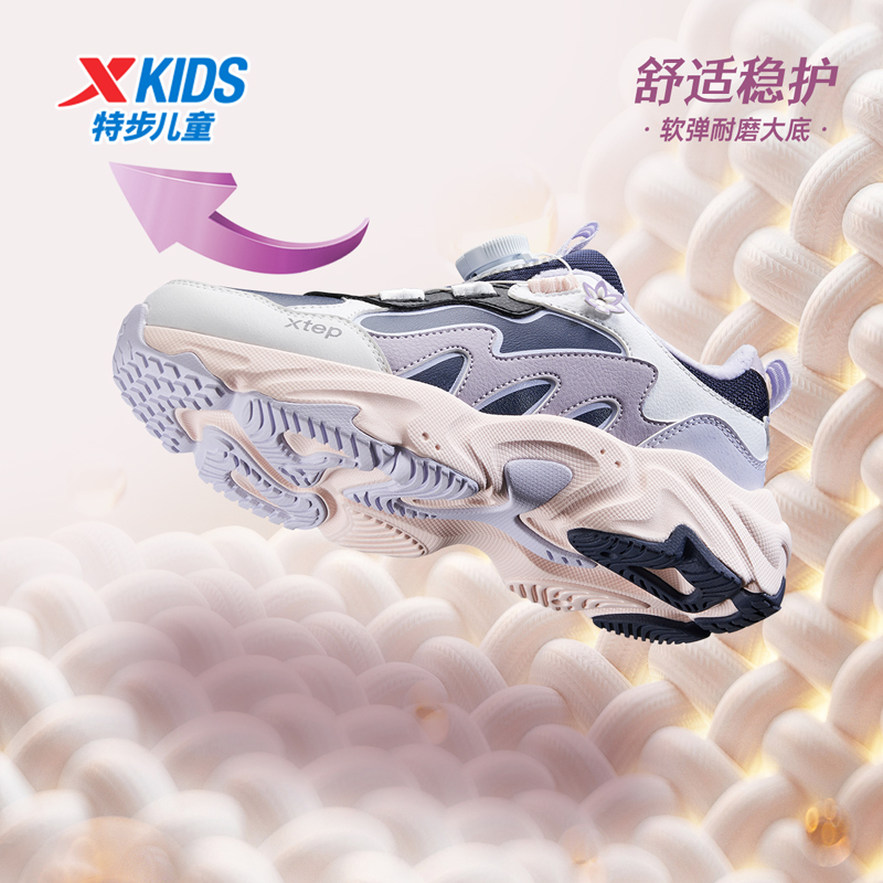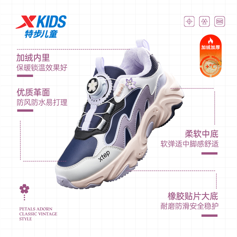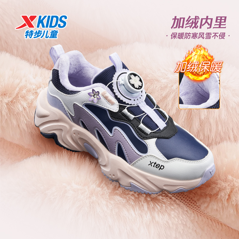 女童中大童运动休闲旋转扣革面加绒内里防滑耐磨棉鞋 特步童鞋 冬季