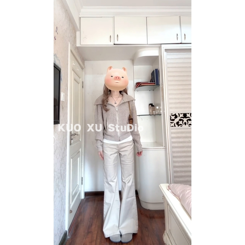 修身 套装 短款 拖地裤 外套浅卡其色微喇牛仔裤 秋冬穿搭翻领针织开衫