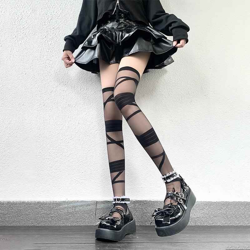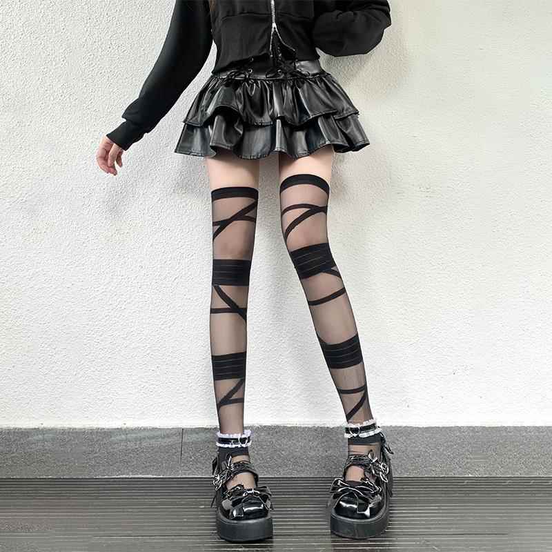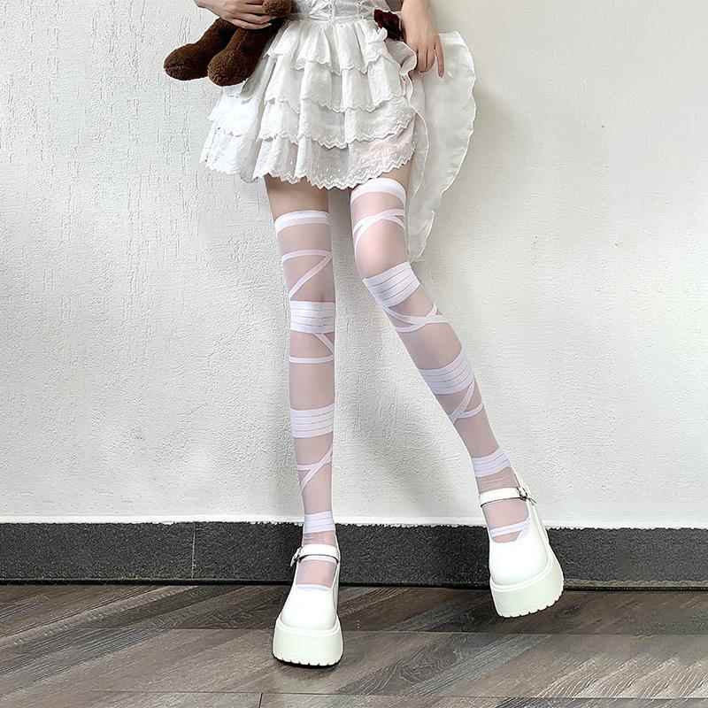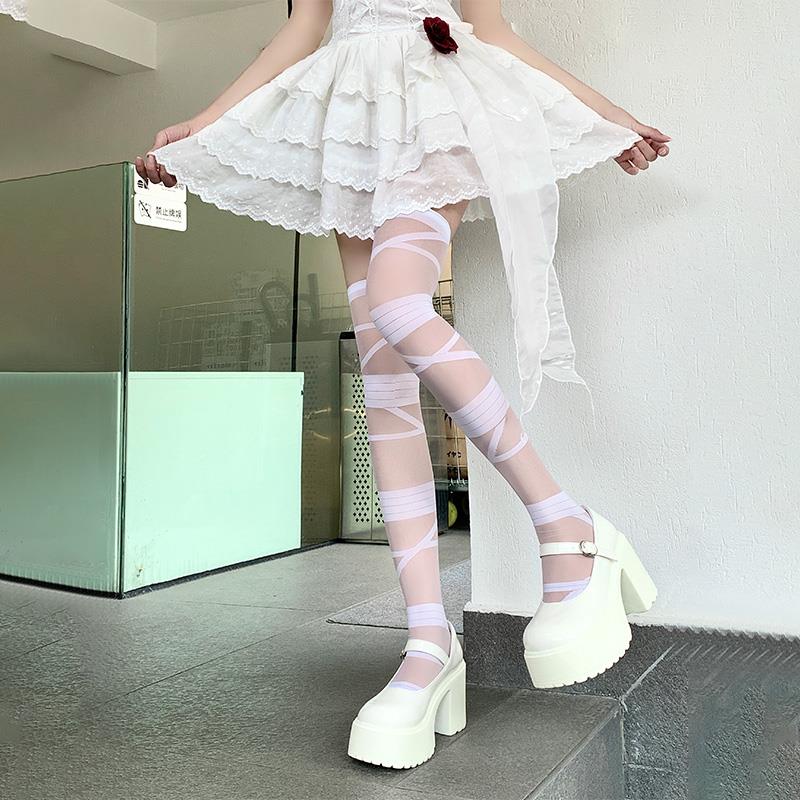 绑带丝袜y2k薄款 辣妹亚文化黑白色绷带长筒过膝堆堆袜女洛丽塔袜