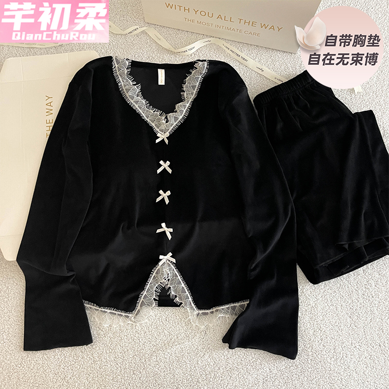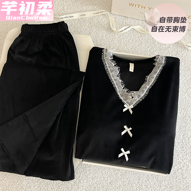 海岛绒睡衣女春秋冬季 花边性感网红风带胸垫薄绒家居服两件套 长袖