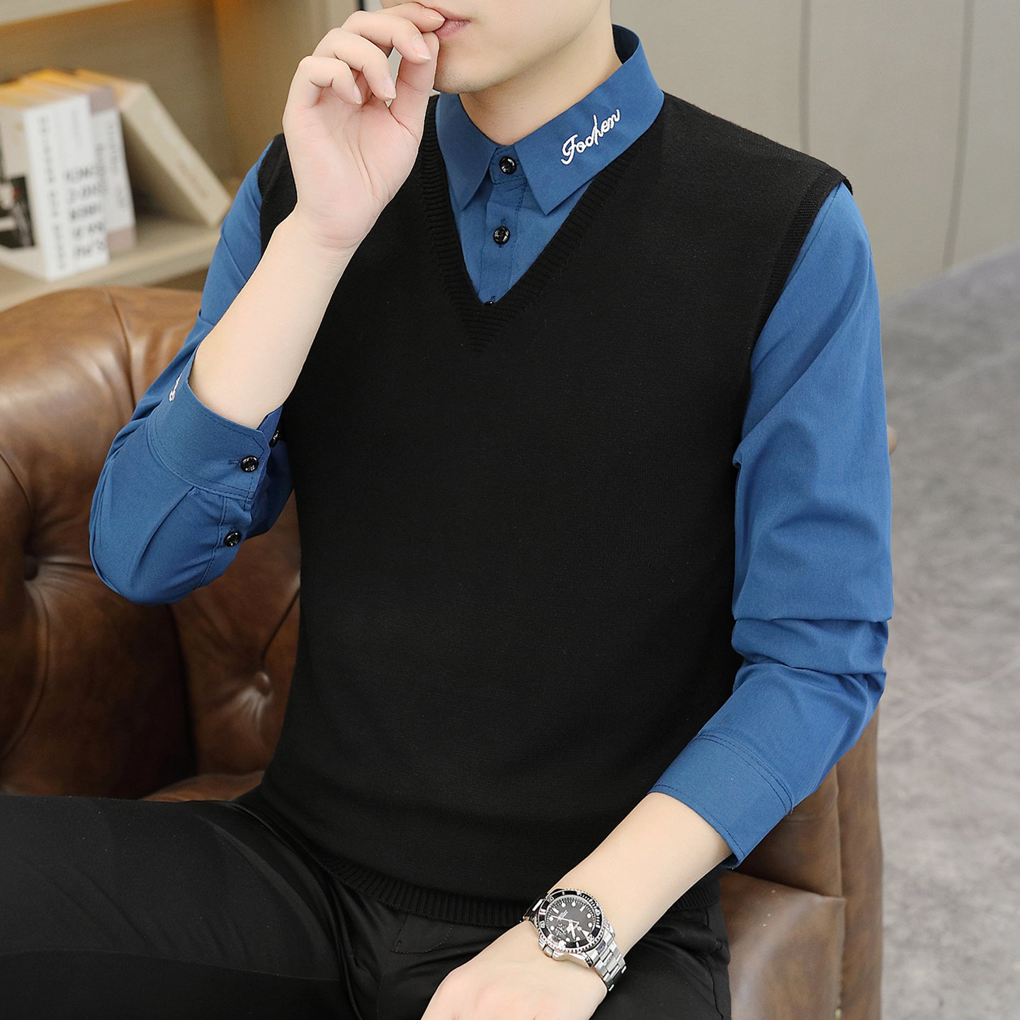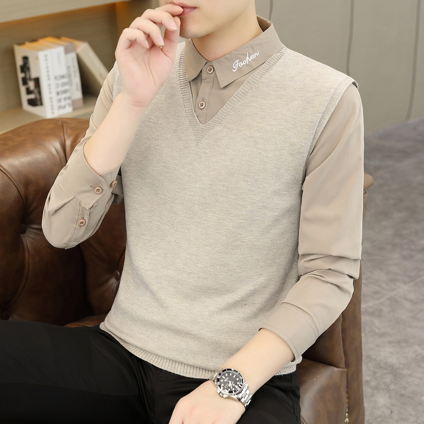 领针织套头马甲打底衫 字母刺绣青年潮流衬衫 男士 假两件毛衣秋冬季