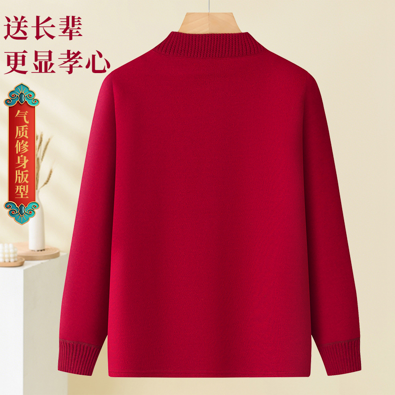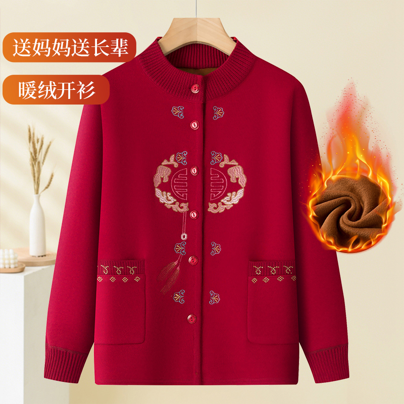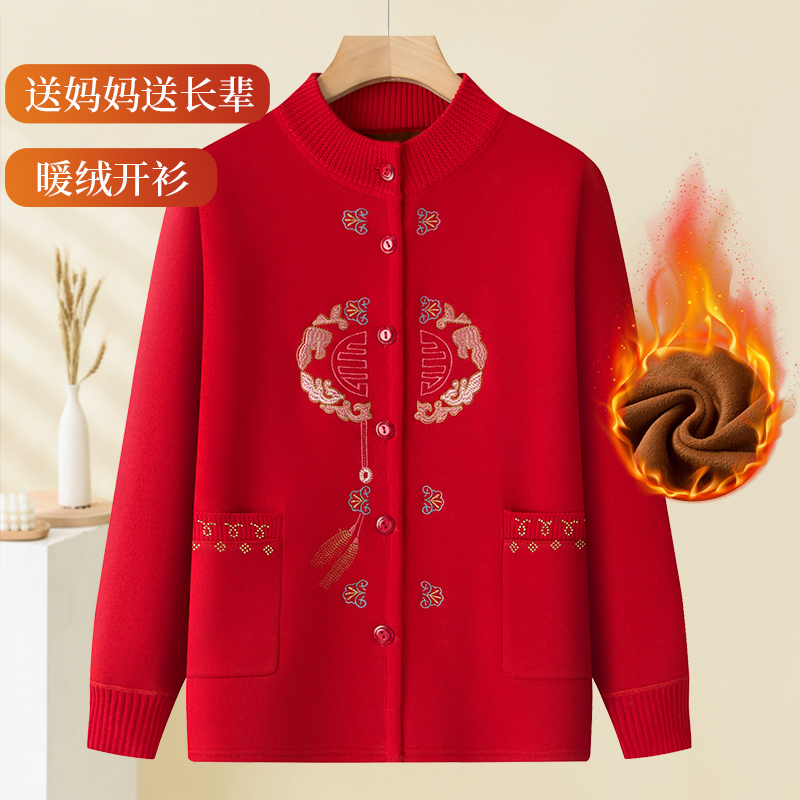 开衫 奶奶秋冬款 冬季 加绒加厚毛衣老人女妈妈装 喜庆红色外套 针织衫