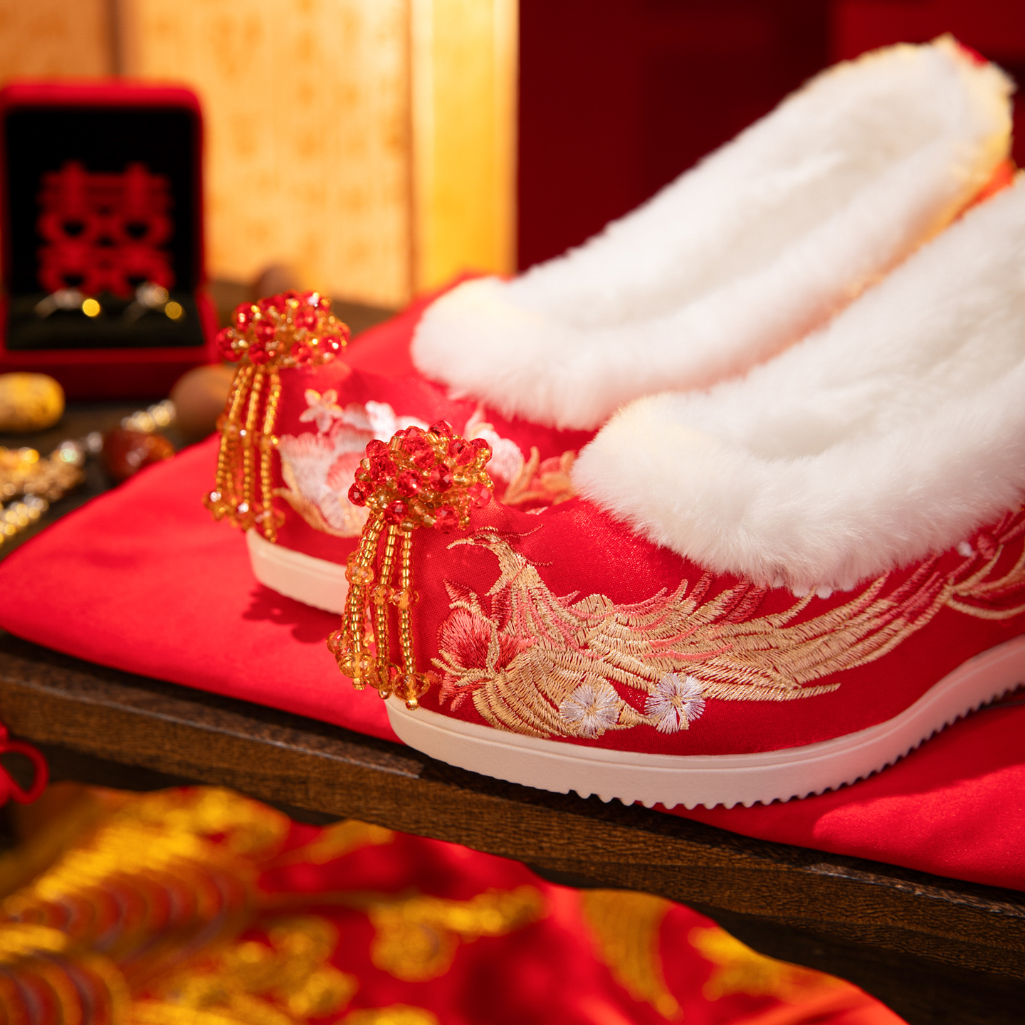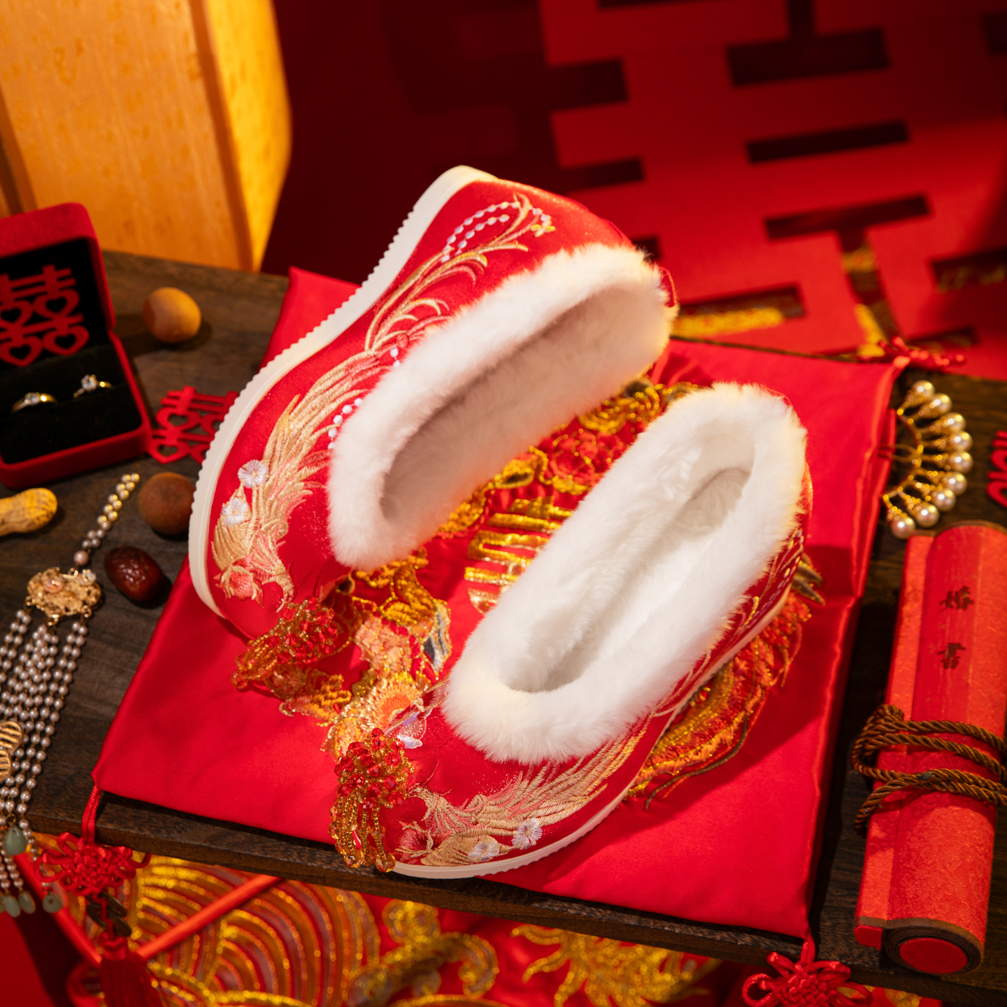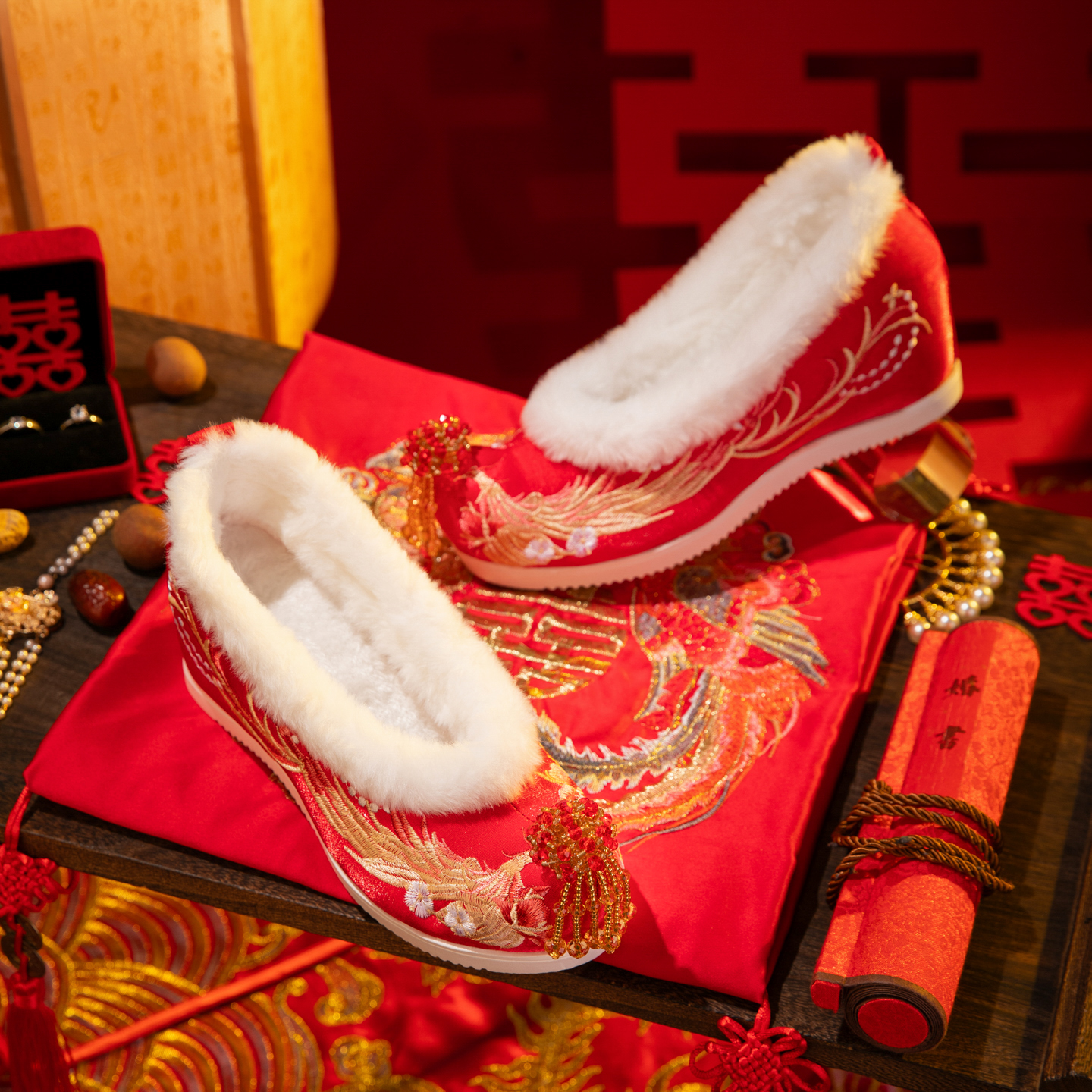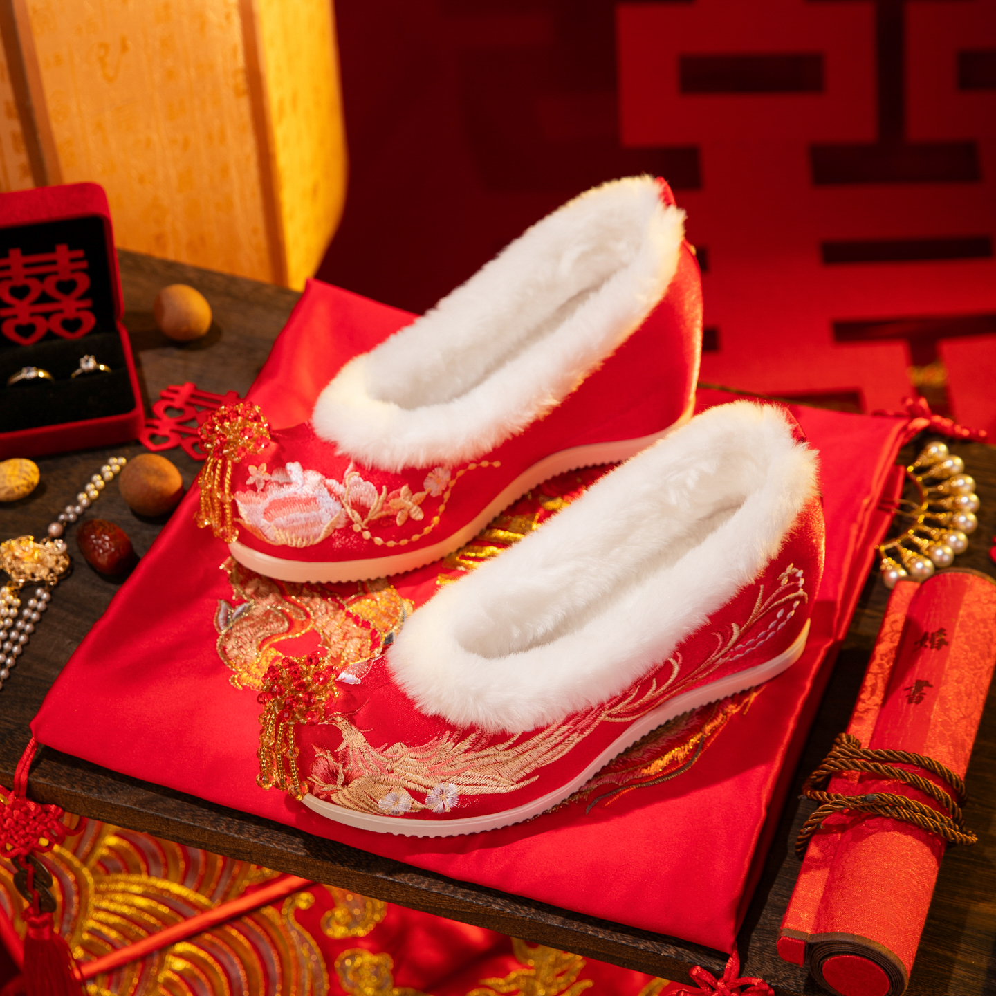 婚鞋 配汉服秀禾婚鞋 女冬季 加绒增高新娘结婚绣花棉鞋 新款 红色中式