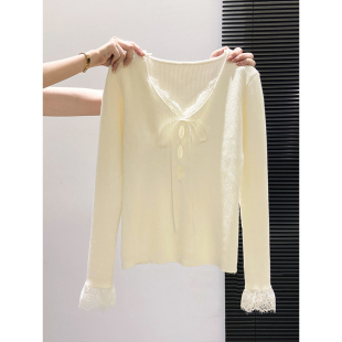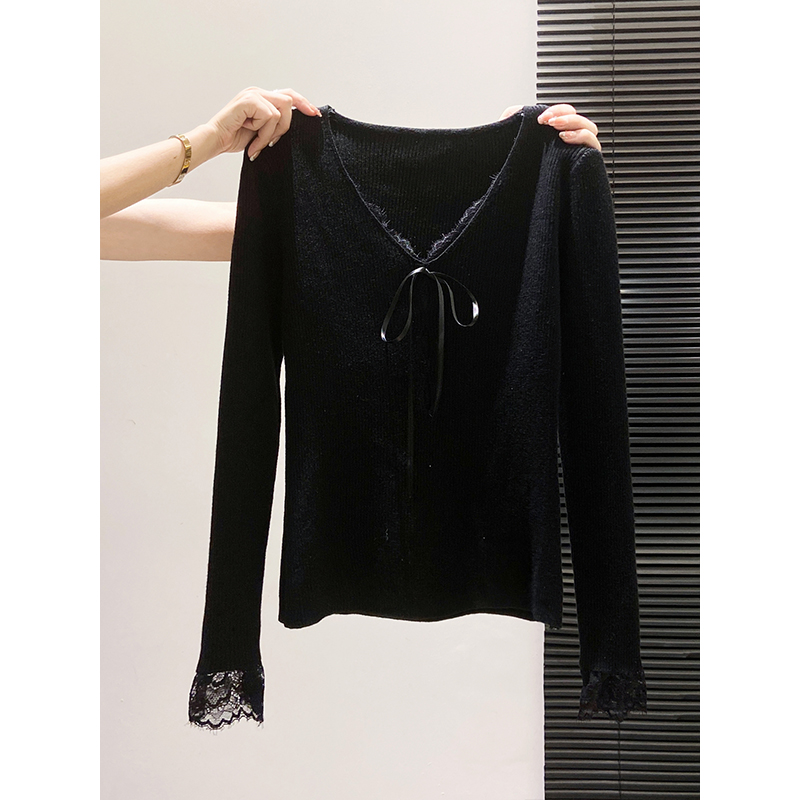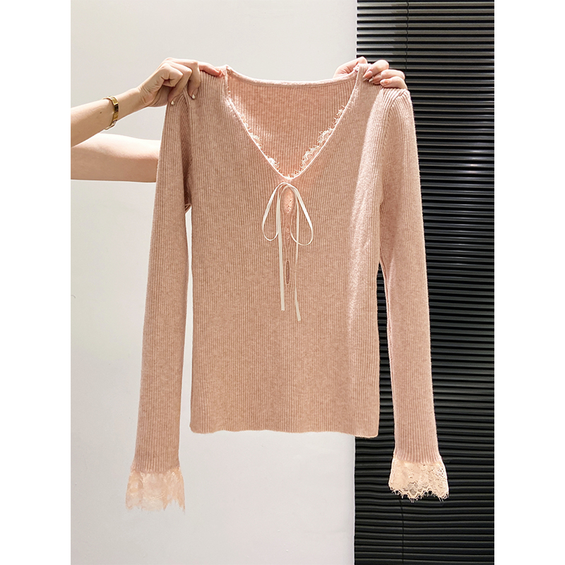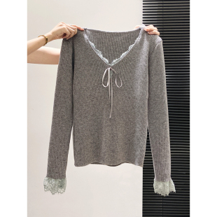 修身 纯欲V领拼接蕾丝系带长袖 新款 女2025秋季 显瘦打底上衣 针织衫