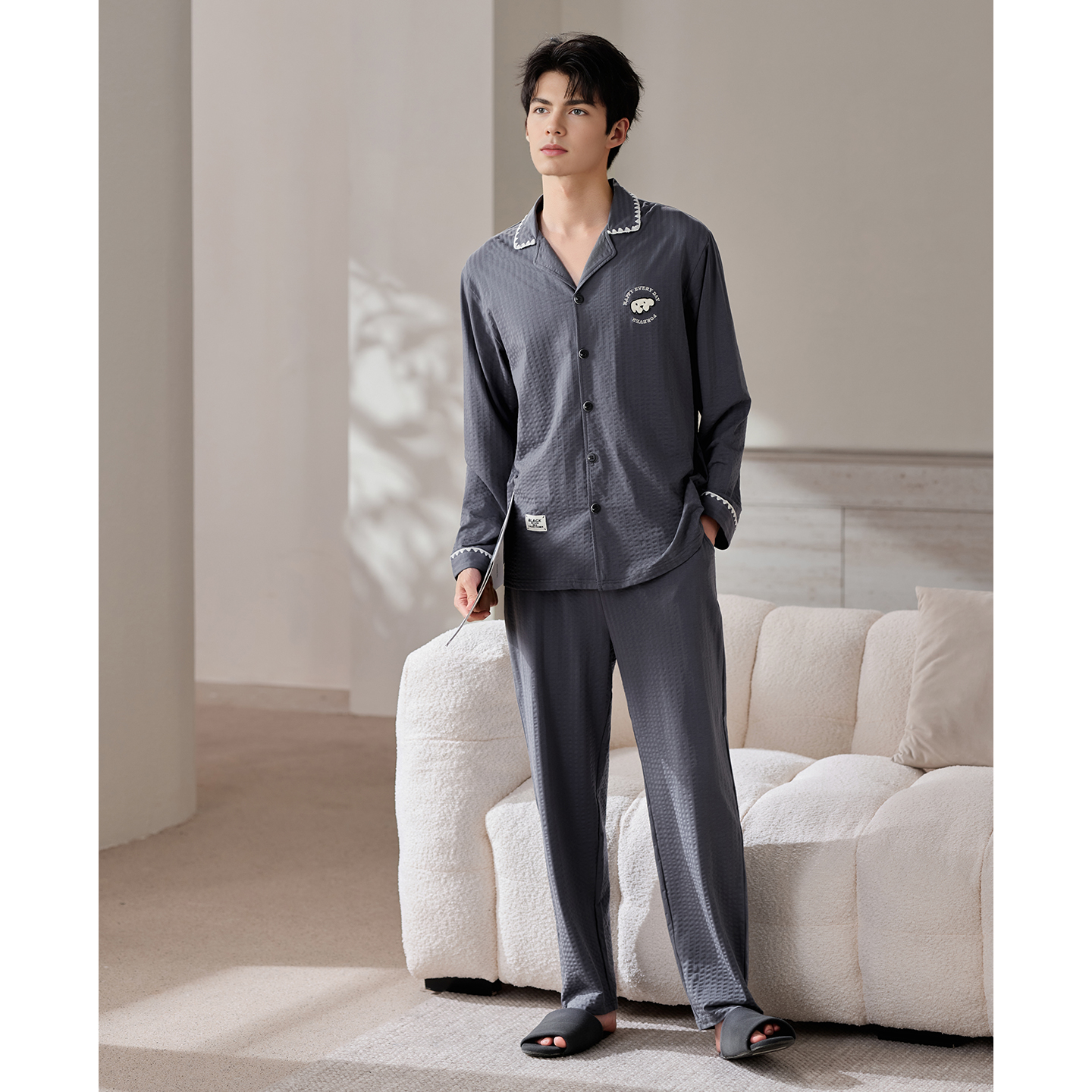 纯棉开衫 长袖 休闲大码 睡衣春秋季 家居服 男款 新款 套装 芬腾男士 长裤